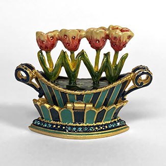 pleasures“, Jardaniere made of goldtone metal with turquoise and dark blue enamel, the bottom edge is decorated with turquoise crystals, both handles with dark blue crystals, 4 tulips with yellow, red and green enamel, on the outside of the calyxes there are red crystals, inside the calyxes there are larger yellow crystals, golden label on bottom, 46 mm tall, 62 mm in width, unused condition, complete with white outer box, blue-gold box, blue-gold satin pouch and certificate, designed by Jay Strongwater