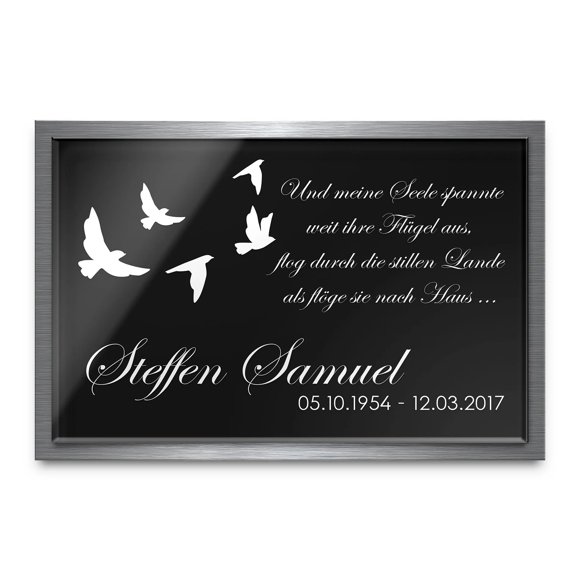 Grabtafel aus Hochglanz Acrylglas mit Edelstahl Hintergrundplatte 30×20 cm