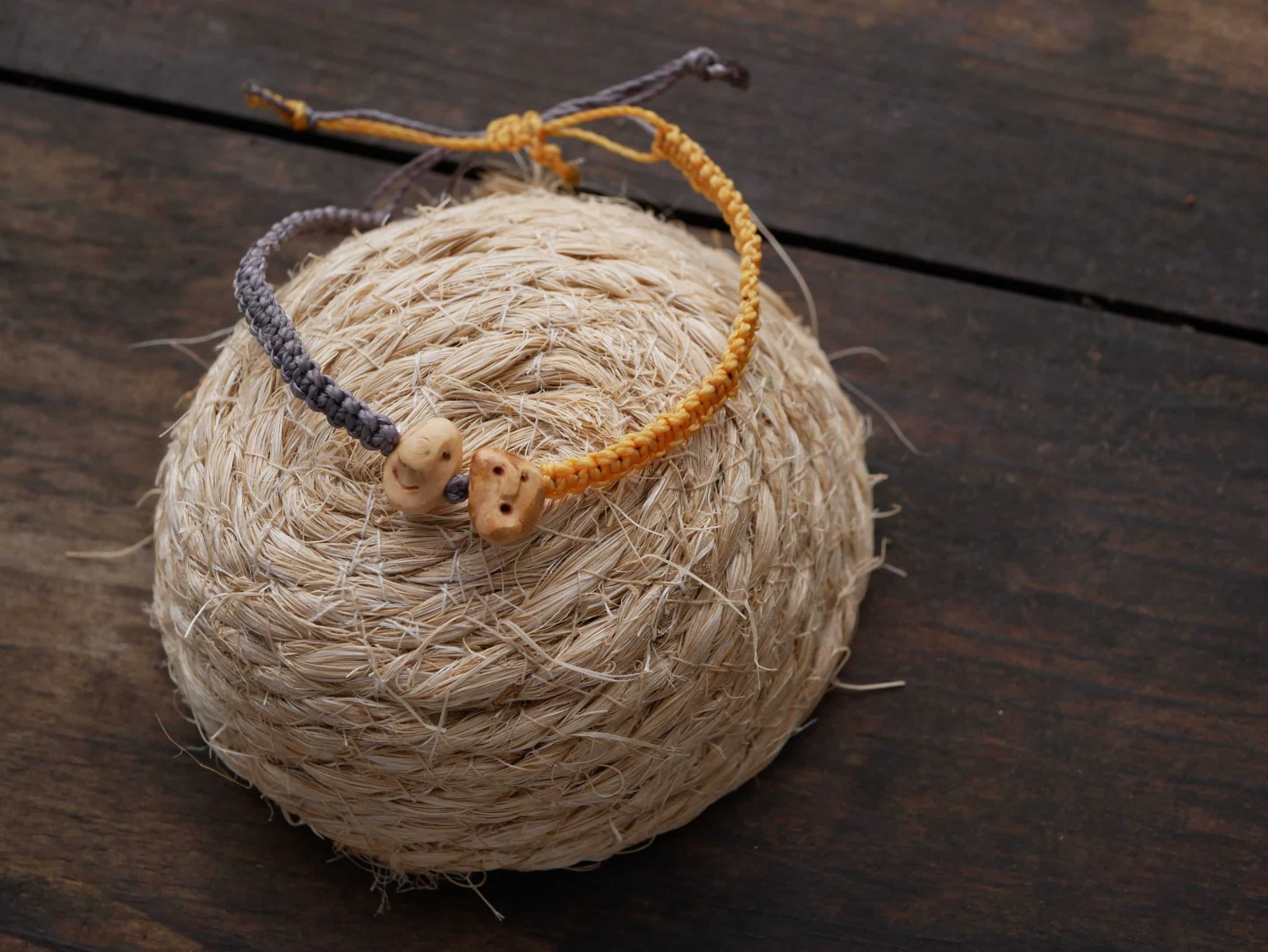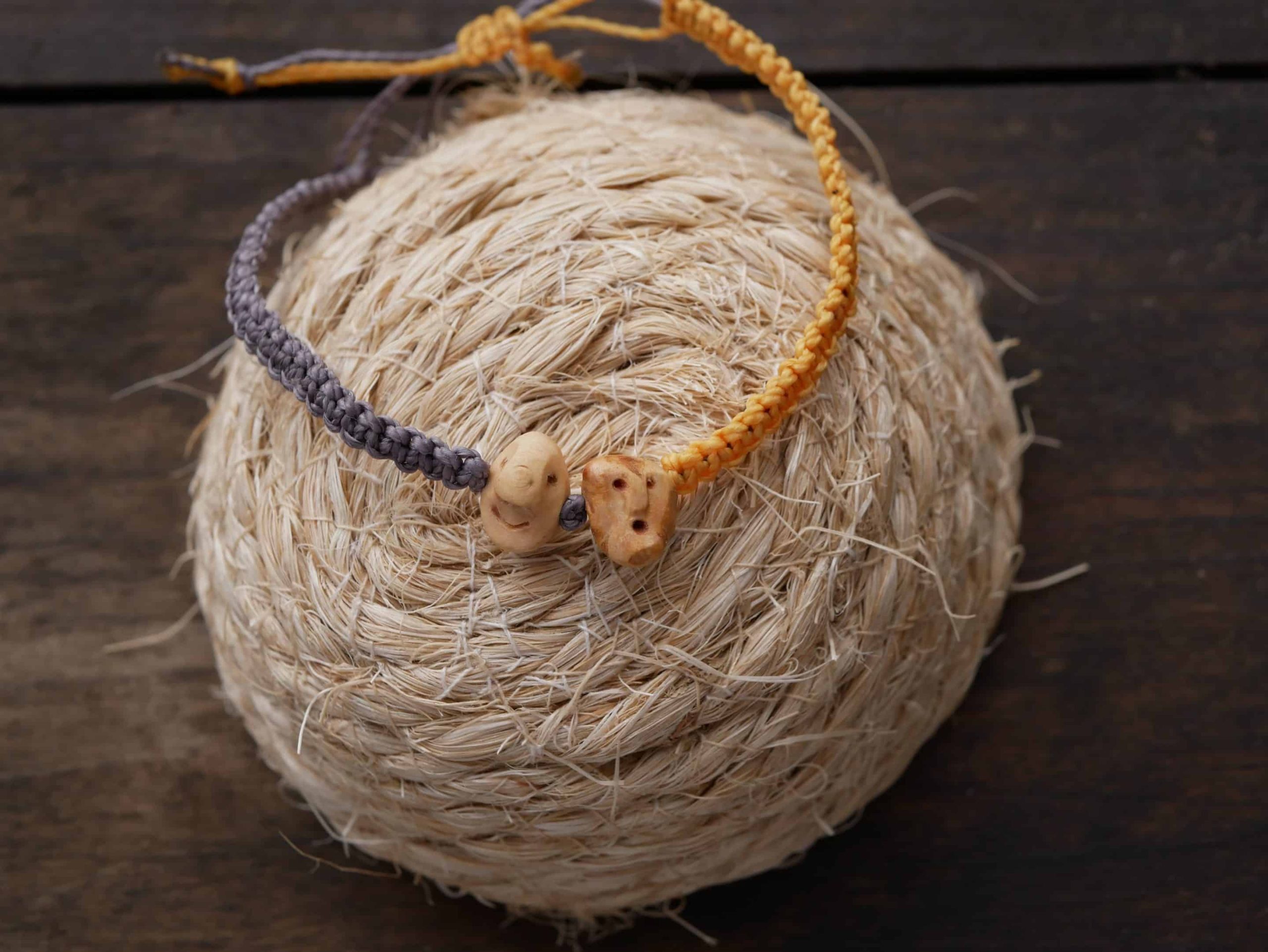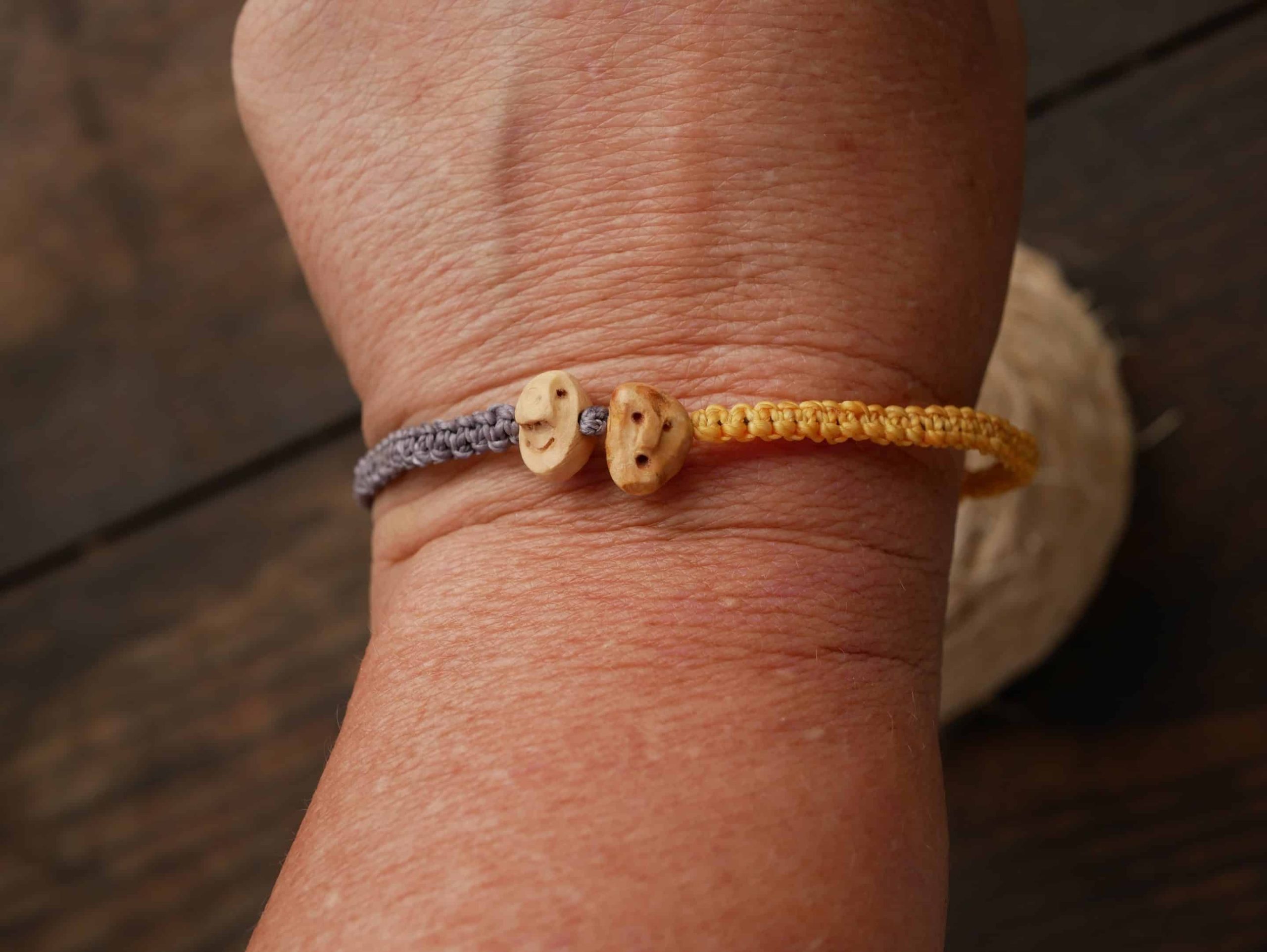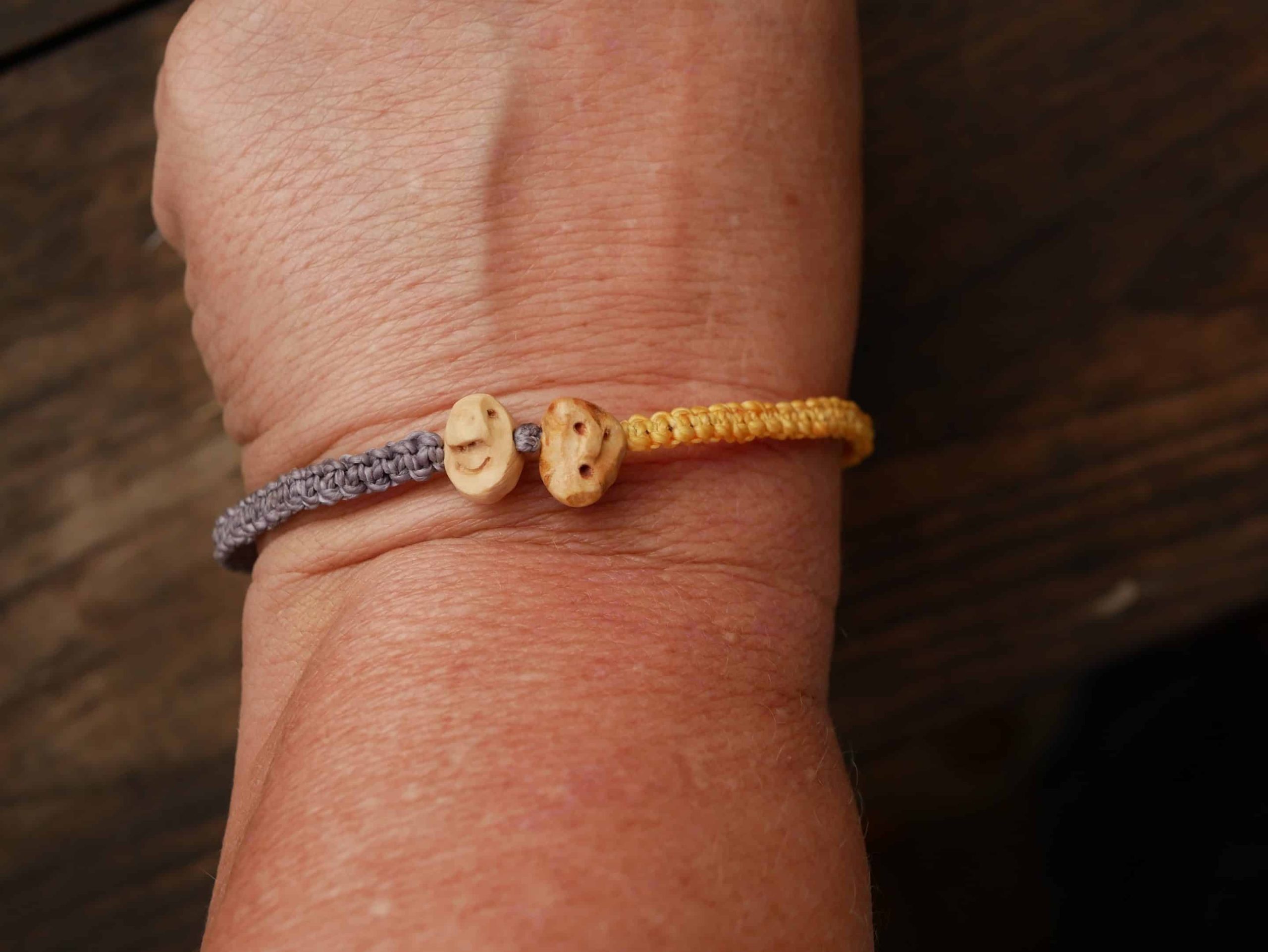 Trage die perfekte Balance am Handgelenk – das handgefertigte Makramee-Armband „Wichtel-Duo“ erzählt die Geschichte von zwei Baumperlen-Wichteln, die unterschiedlicher nicht sein könnten, aber gemeinsam ein harmonisches Team bilden.
