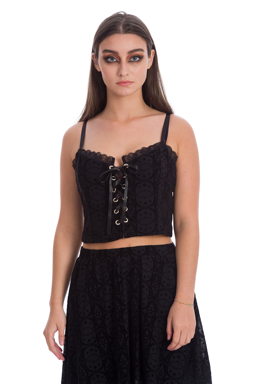 Süßes schwarzes Crop Top von Banned aus einem Stoff mit burned Velvet Optik, Rüschenborte oben und Schnürung vorn.