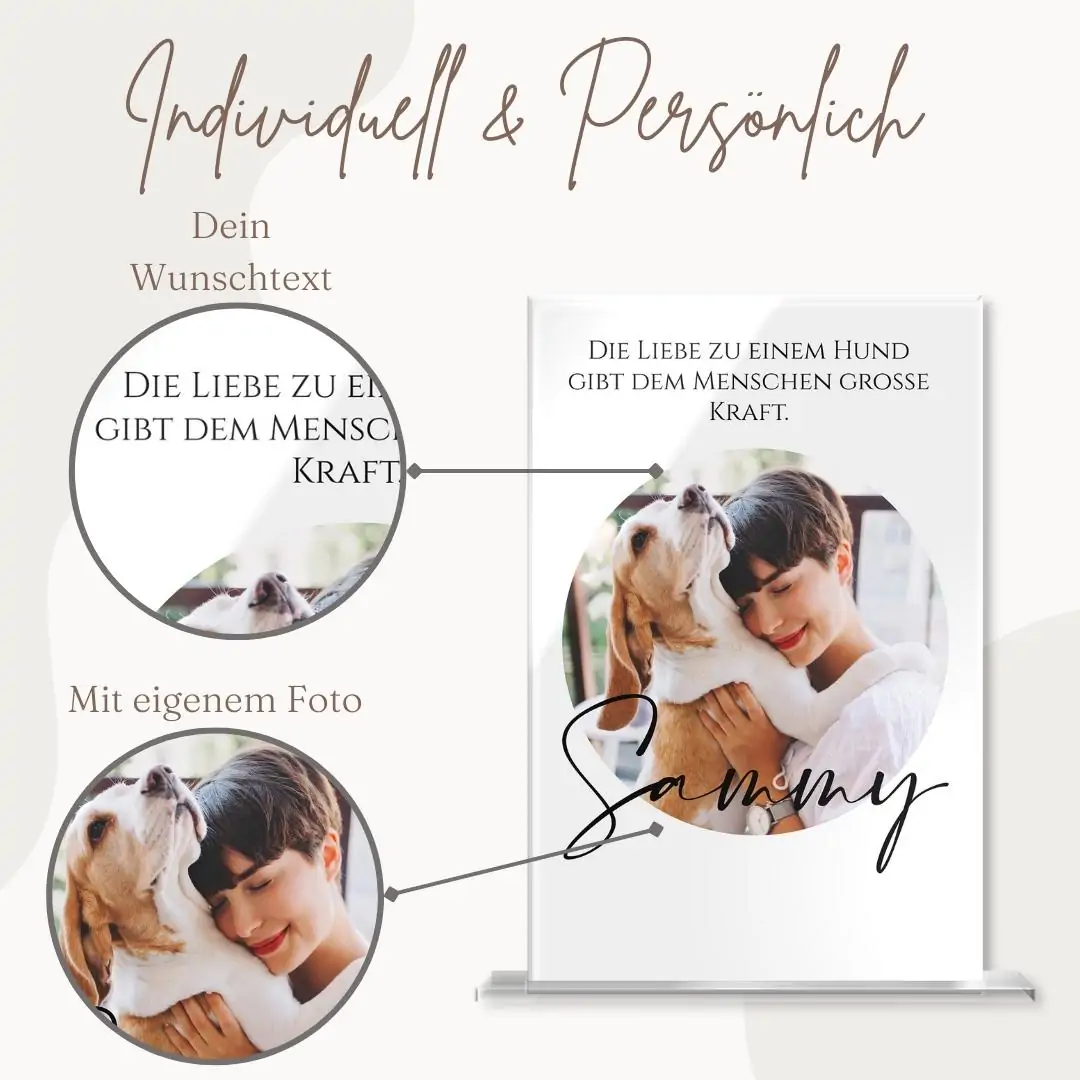 Mache Dir selbst oder Deinen Liebsten mit unseren umwerfenden Standbildern aus Hochglanz Acrylglas eine unvergleichliche Freude. Halte einen einmaligen Augenblick, eine besondere Freundschaft oder die Liebe zu Deinem tierischen Freund mit unseren individuell designbaren Bildern zum Aufstellen fest. Der kratzfeste und langlebige Fotodruck kann wahlweise mit einem persönlichen Schriftzug oder einem hübschen Motiv zusätzlich veredelt werden. Dein personalisiertes Standbild wird inklusive Standfuß in klarer Acrylglas Optik geliefert. Lasse Dich auch im Dunklen von dem einmaligen Design faszinieren, indem Du hinter dem Bild eine Kerze anzündest, so dass es im romantischen Kerzenschein leuchtet.