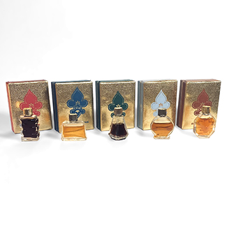 5x 1-1/4 dram perfume, golden screw-on lids, 4x paper labels with brown print, 1x transparent label, each mini perfume with it’s own box, with outer box, USA; the large box is in vintage condition
