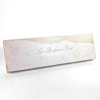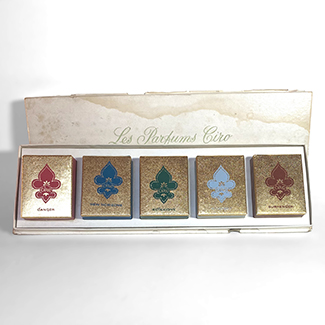 5x 4,7 ml Parfum, goldene Schraubverschlüsse, 4x Papieretiketten mit braunem Druck, 1x transparentes Etikett, jede Miniatur mit eigener Box, mit Überkarton, USA; die große Box ist in altersbedingtem Zustand