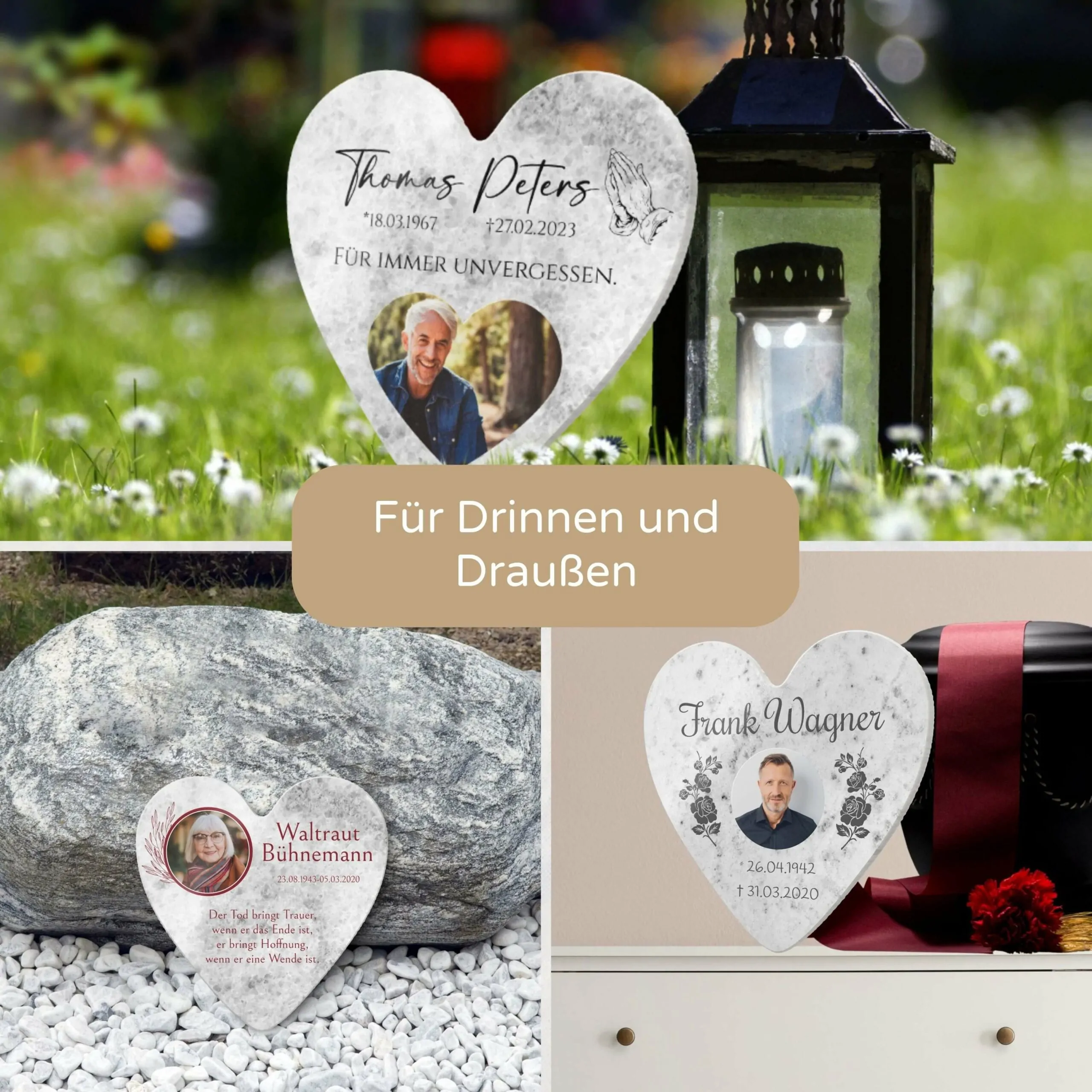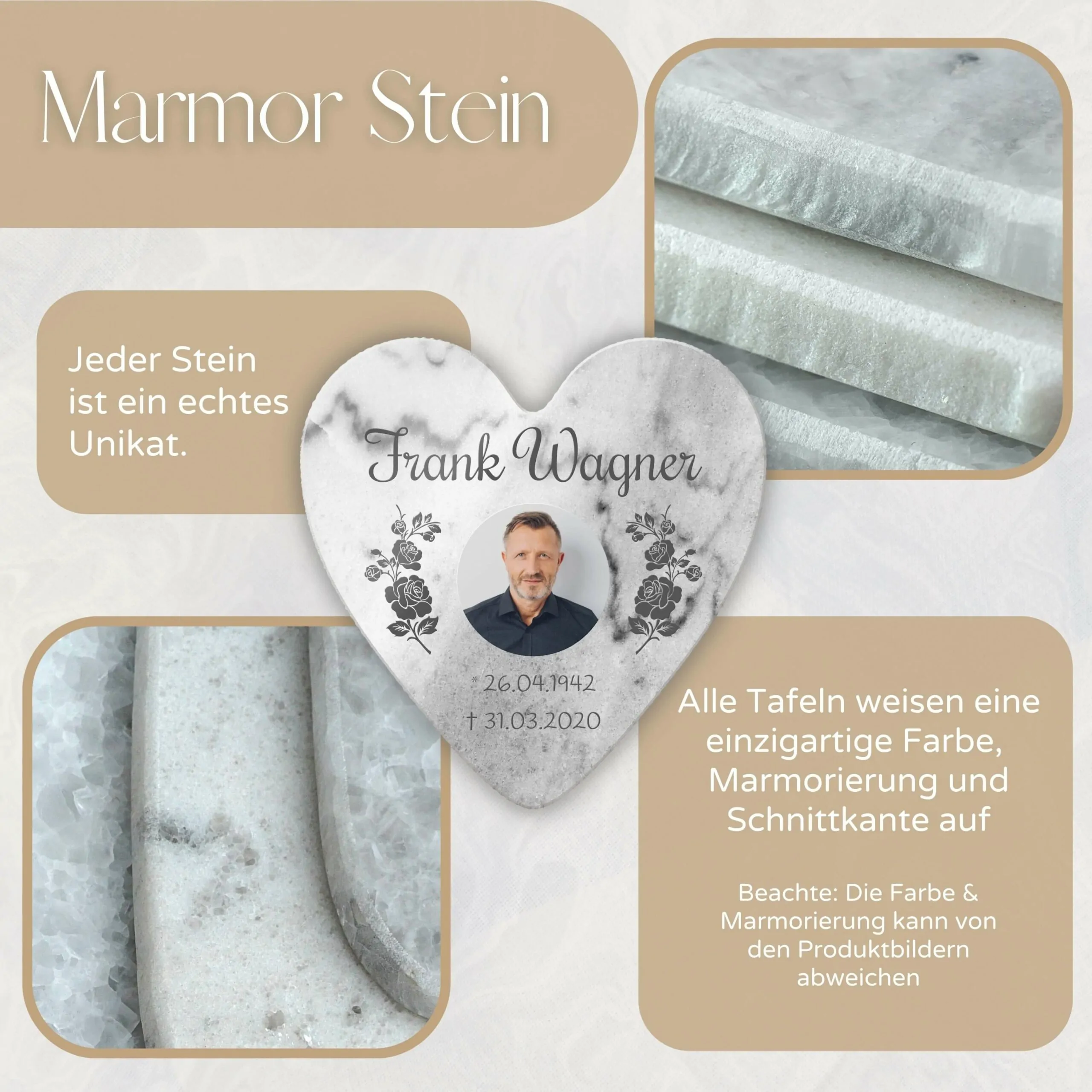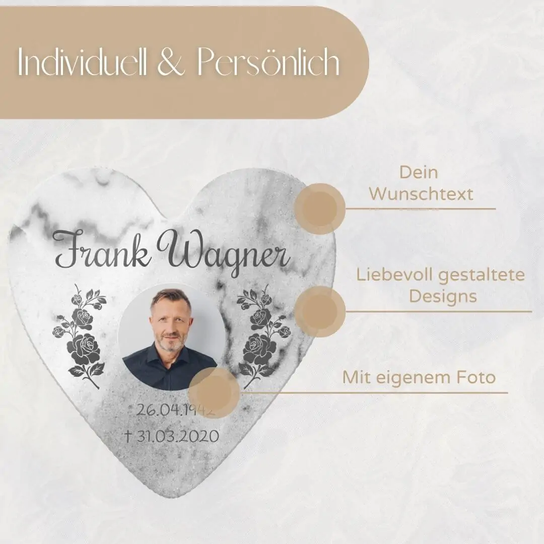 Unsere personalisierten Grabplatten sind ein würdiges Andenken an einen geliebten Menschen. Egal, ob Opa, Oma, Papa, Mama oder Geschwister – jeder verdient ein individuelles und besonderes Gedenken. Unsere hochwertigen Marmor Gedenk Steine sind vielseitig einsetzbar als: Grabstein Urnengrab – Sternenkinder Andenken – Trauerstein – Gedenkstein – Grabtafel – Urnentafel. Der schöne Grab Schmuck ist für das Begräbnis auf dem Friedhof Grab im Außenbereich geeignet, kann aber auch im Innenbereich als Erinnerungstafel zur Trauer Bewältigung aufgestellt werden.