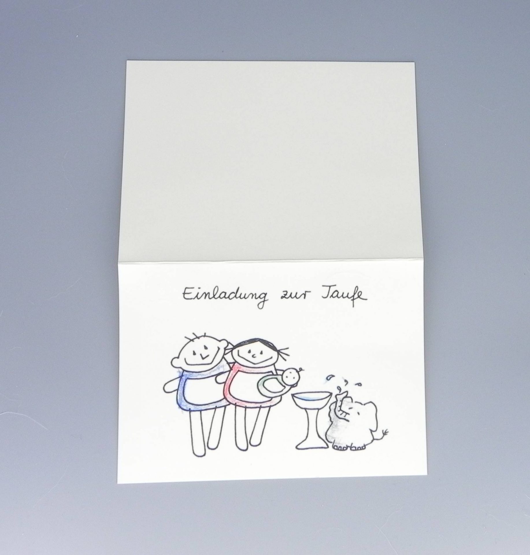 „Einladung zur Taufe“ nini san Klappkarte zur Taufe mit nini san Mädel und Junge und Baby neben Taufbecken und Elefant.
