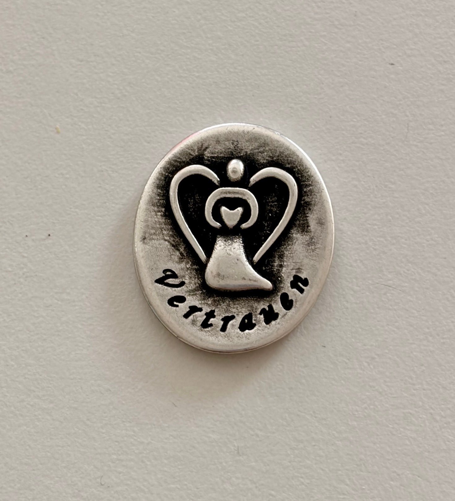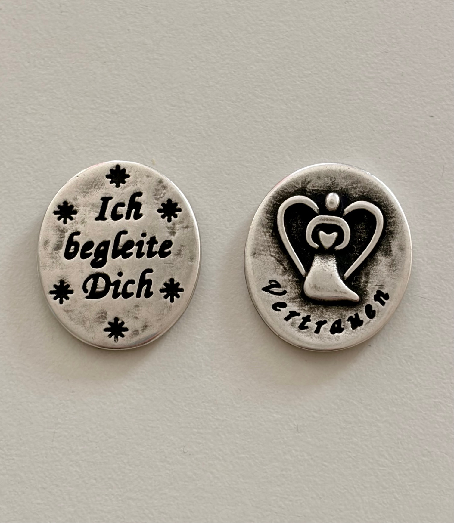 Engel Münze versilbert (gehämmertes Material) mit der Botschaft: „ich begleite Dich“, Rückseite mit Schriftzug VERTRAUEN und einem Schutzengel mit Herz.