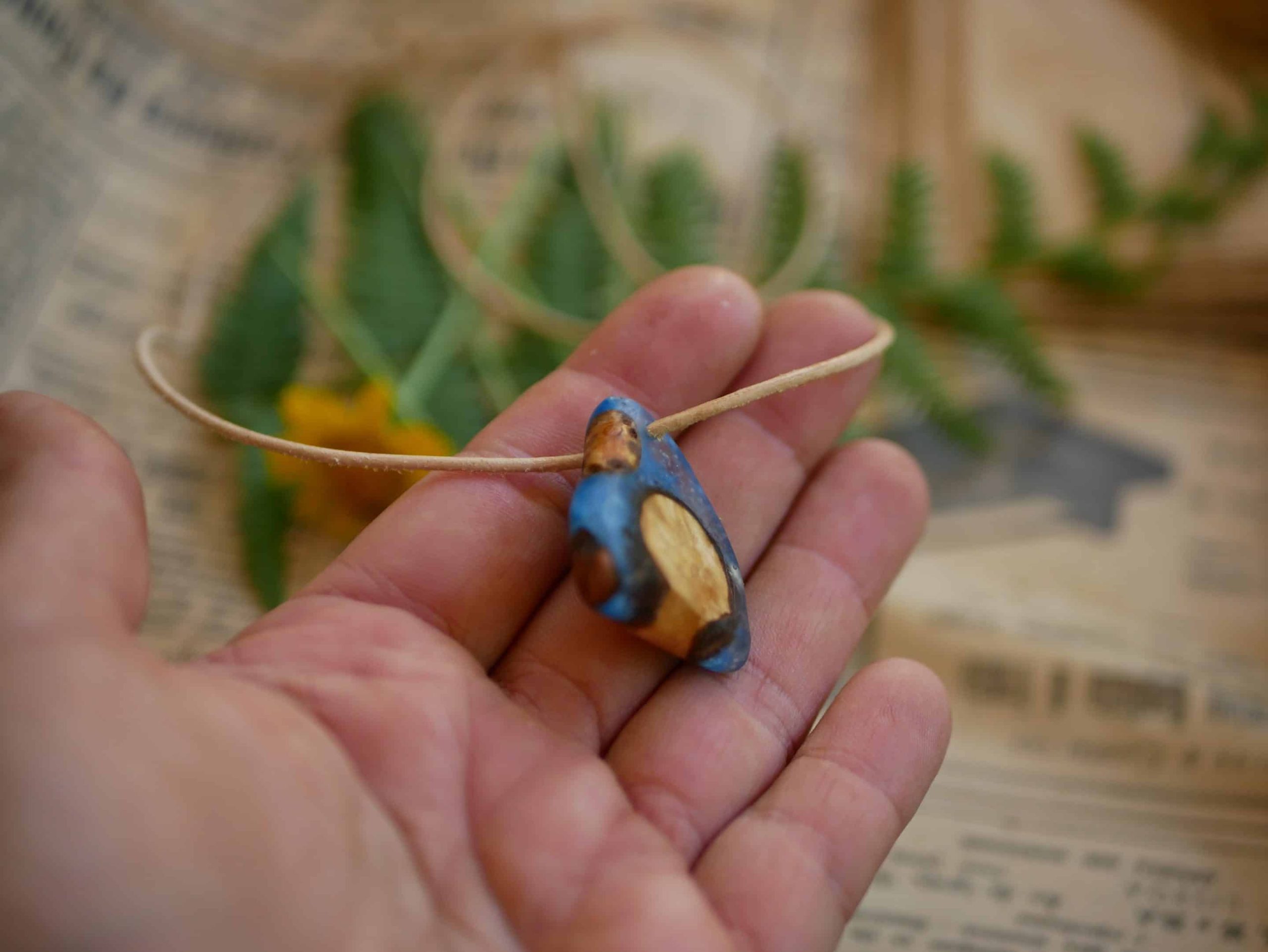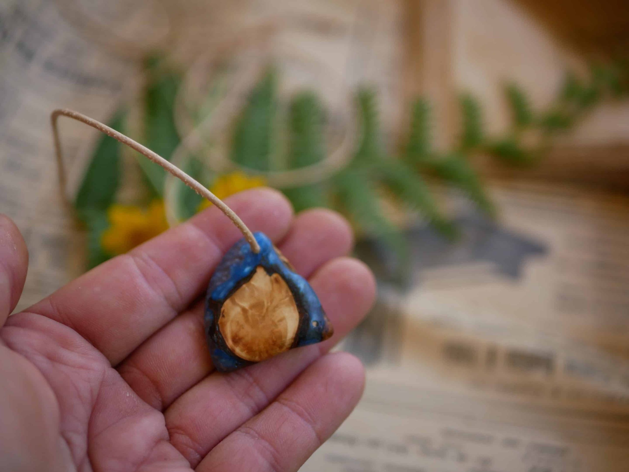 Baumperlenkette mit Epoxidharz und blauer Farbe.