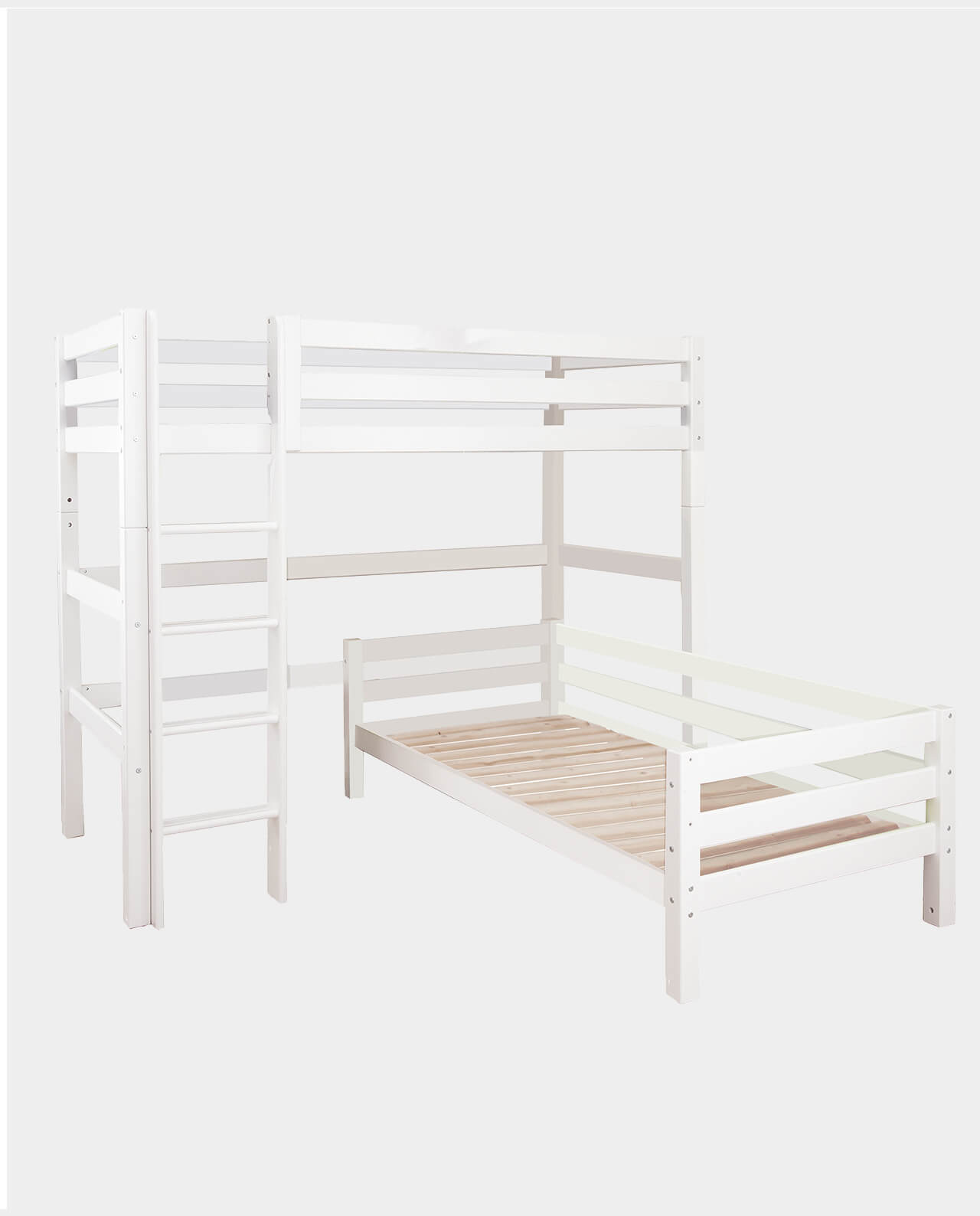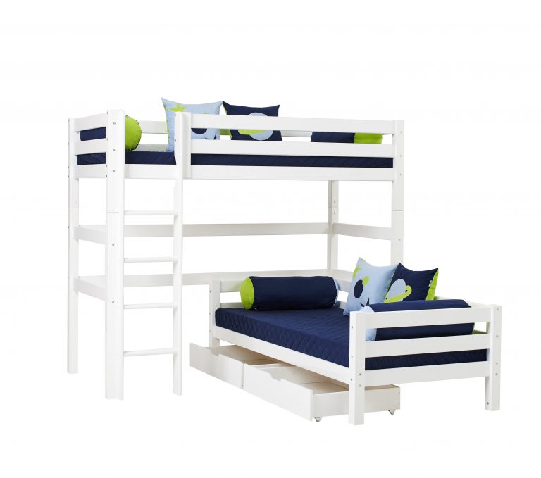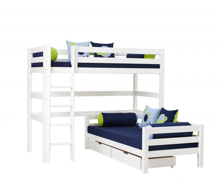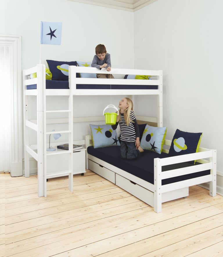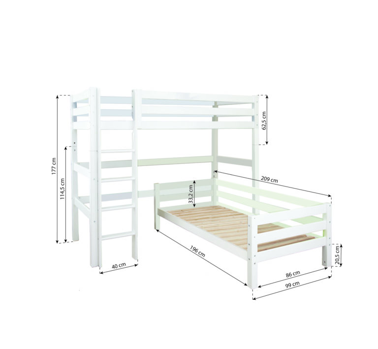 Das ECO LUXURY Etagenbett mit Winkel in den Größen 90×200 cm mit gerader Leiter ist ein Kinderbett für Zwei. Es wird aus massiver nordischer Kiefer gefertigt und ist mit dem Nordischen Umweltzeichen ausgezeichnet. Die Höhe unter dem unteren Bett beträgt 20cm. Der Abstand vom Boden bis zum Hochbett beträgt 135cm. Die Leiter kann sowohl auf der linken als auch an der rechten Frontseite des Bettes angebracht werden. Die Leiter hat Rillen und tiefe Stufen. Dadurch hat das Kind beim Aufstieg einen besseren Halt. ECO LUXURY ist ein flexibles und langlebiges Etagenbett mit höchstem Komfort und größtmöglichem Augenmerk auf die Sicherheit. Dazu kommt die Stabilität und die lange Haltbarkeit sowie die breite Palette an Modulen und Zubehör. Das Bett ist modular umbaubar und kann beispielsweise in zwei einzelne Kinderbetten verwandelt werden. So wächst das Bett mit den Anforderungen und Bedürfnissen des Kindes. Das Hochbett kann auch unabhängig vom Juniorbett gestellt werden. Lattenroste sind bereits in der Lieferung inklusive. Matratzen sind nicht inklusive. Dekorationen sind nicht Teil der Lieferung.