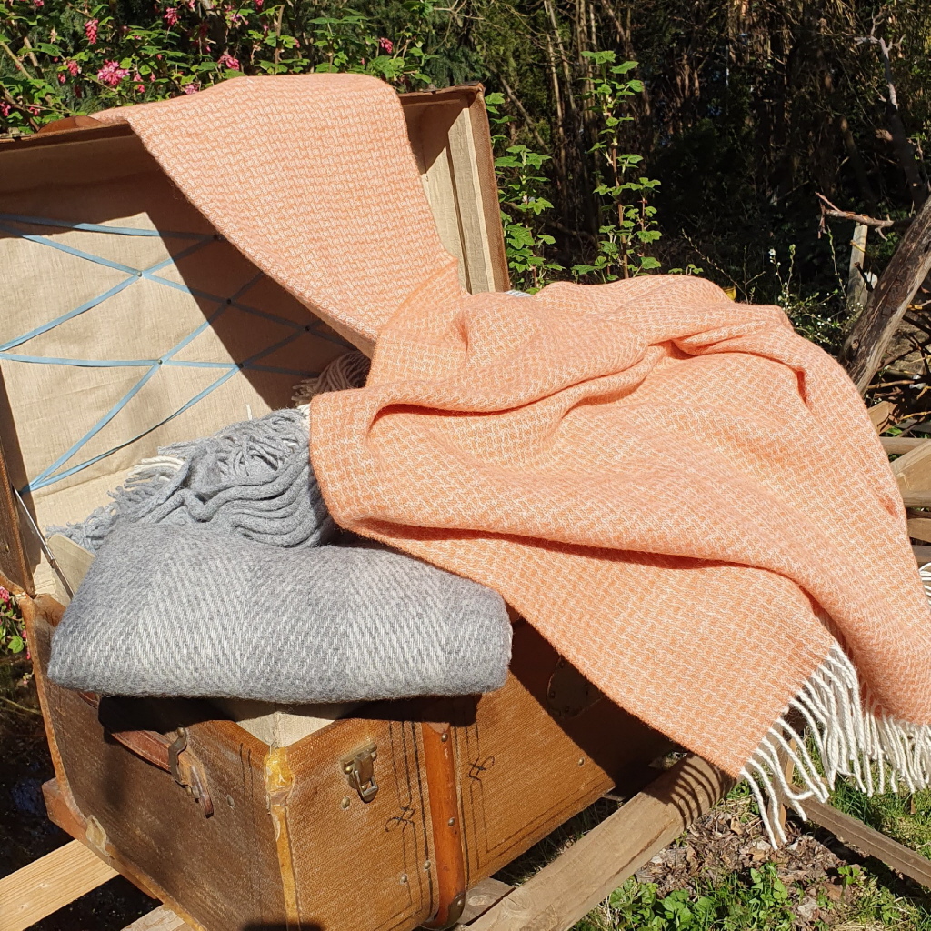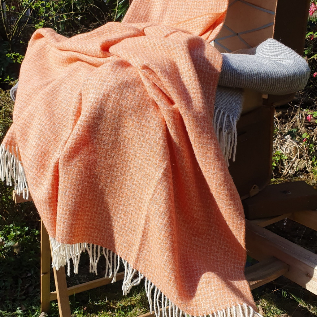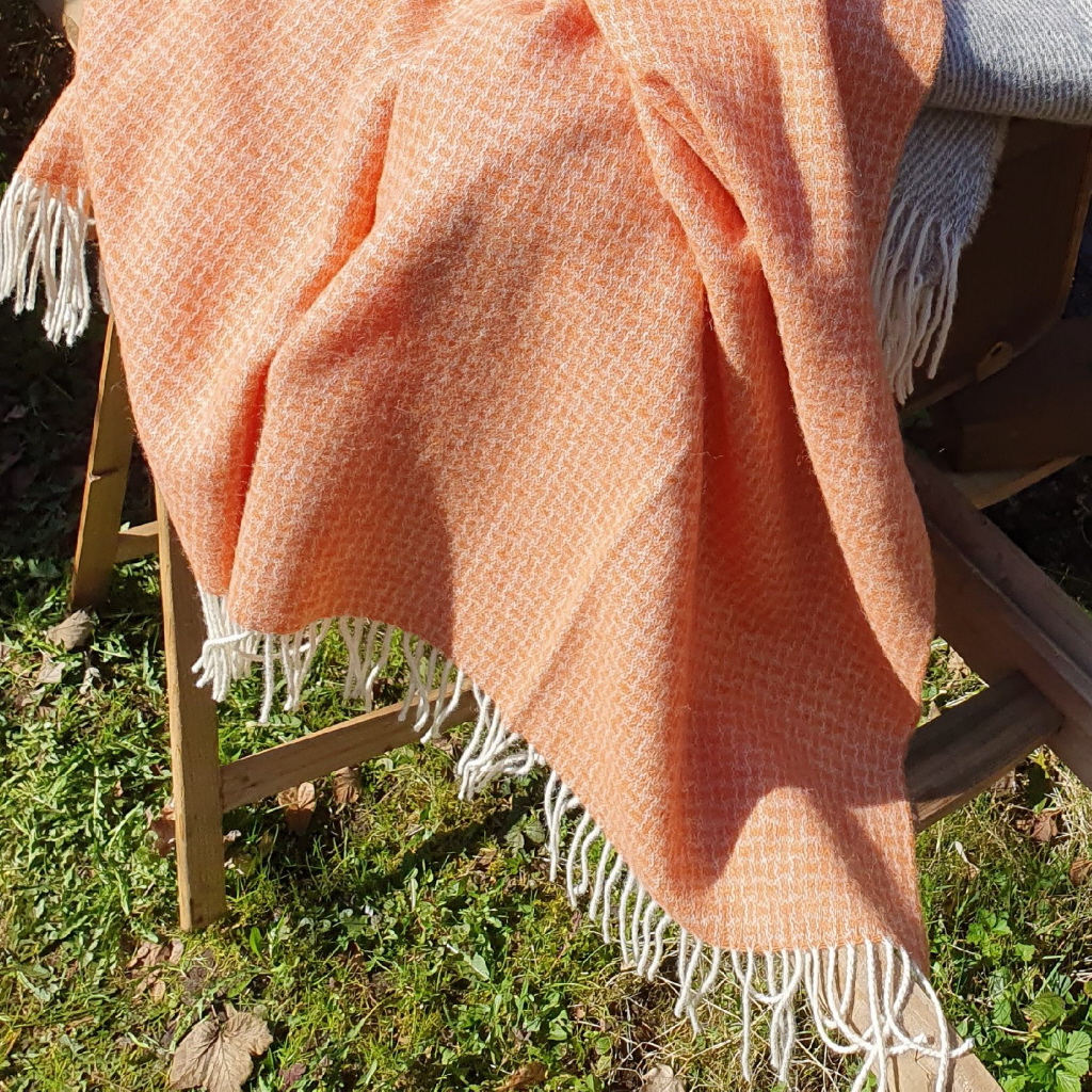 Kleine, präzise Rechtecke, wie ein feines Raster aus Struktur und Rhythmus. Dunklere Töne geben ihr Tiefe, doch diesmal ist da etwas anderes im Vordergrund: ein warmer Lachsfarbton, der sich wie ein letzter Sonnenstrahl durch das Gewebe zieht.