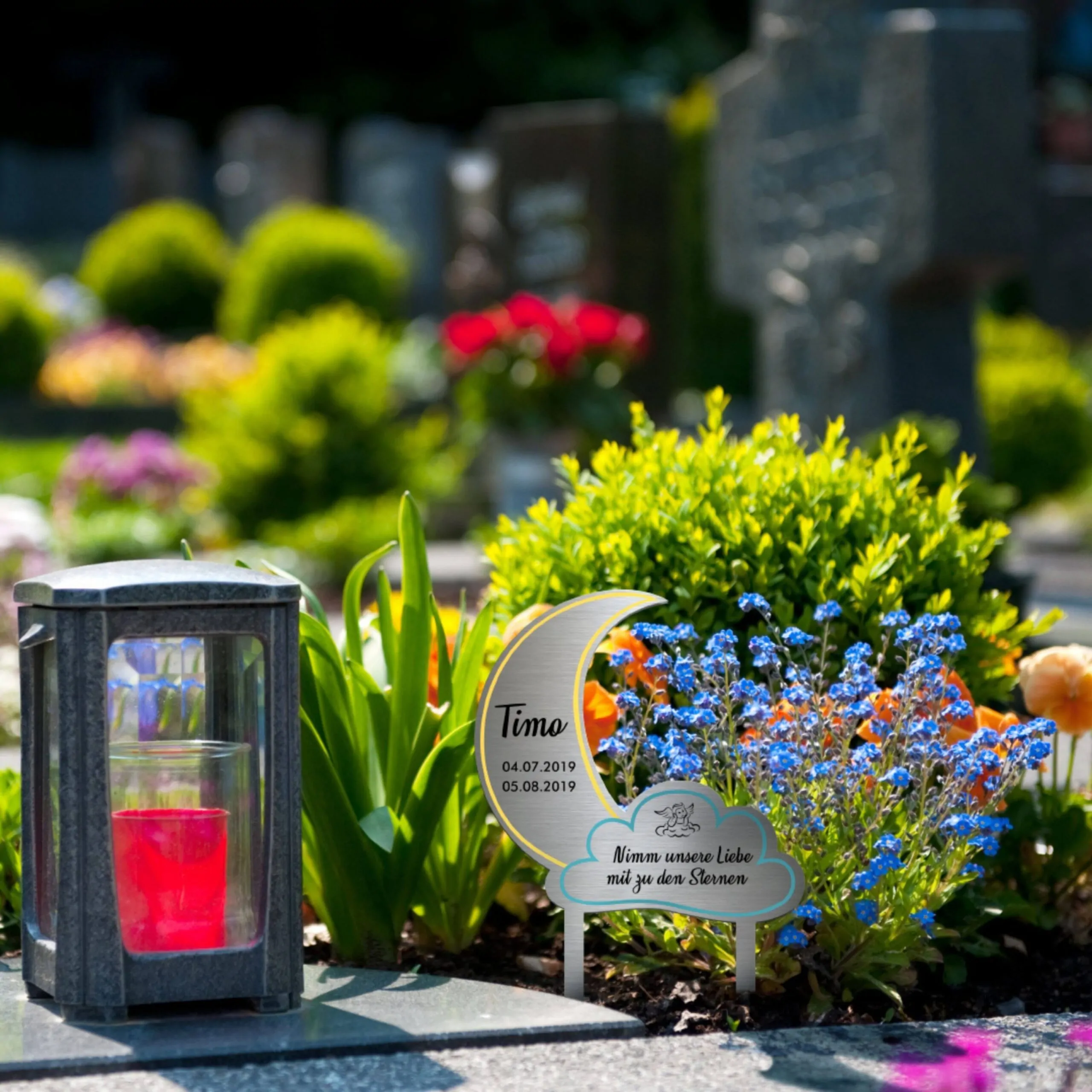 Das Besondere an unserer Grabdeko zum Einstecken ist nicht nur das hochwertige, edle Material sondern vor allem die Möglichkeit das Andenken selbst zu gestalten. Entwerfe eigens abgestimmten “ Wir vermissen Dich Grabschmuck “ und passe Die Friedhofsdeko z.B. auf ein geliebtes Kind / Sternenkind an. Jedes Produkt ist ein wahres Unikat. Du kannst zwischen vielen verschiedenen Formen, wie einem Regenbogen, Herz, Teddy oder Grabkreuz auswählen. Zumdem gibt es eine Vielzahl von liebevoll angefertigten Designs die Du im Konfigurator auswählen und gestalten kannst. Mit Deinen Wunschtext, Motiven und zum Teil ist auch ein eigenes Foto / Bild möglich.