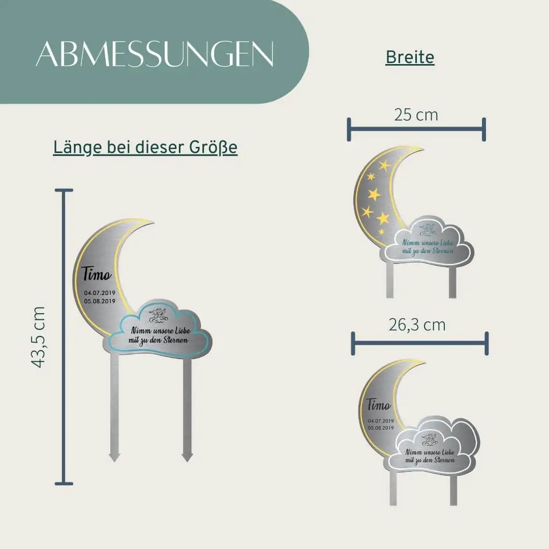 Beachte: Jeder Grabstecker wird individuell für Dich angepasst und hergestellt. Bitte beachte, dass anpassbare, bzw. personalisierbare Produkte grundsätzlich vom Umtausch ausgeschlossen sind.