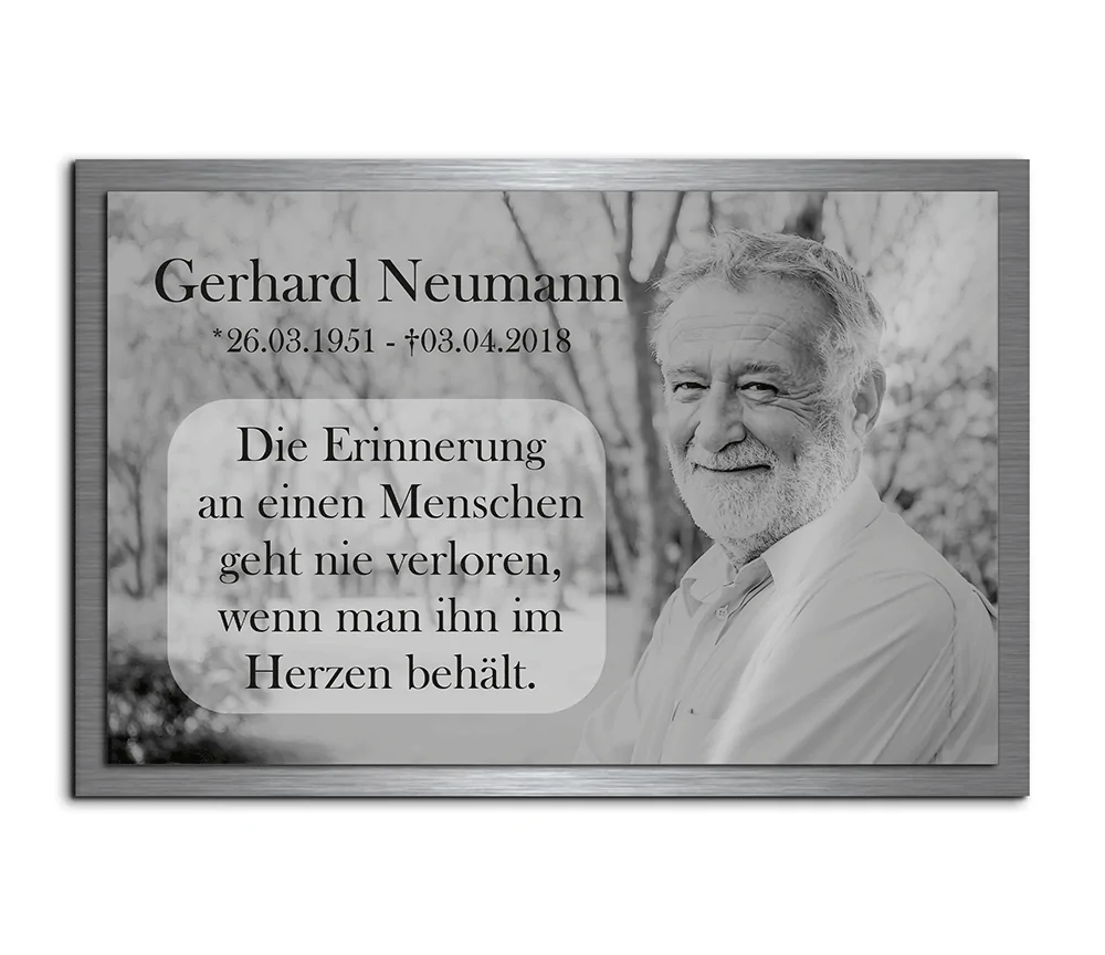 Im Leben gibt es immer wieder Zeiten, in denen wir von einem geliebten Menschen Abschied nehmen müssen. Um Dir bei diesem Abschied ein wenig helfen zu können, haben wir es uns zur Aufgabe gemacht, ein würdevolles Erinnerungsstück zu entwickeln. Herausgekommen sind unsere individuell personalisierbaren Grabplatten aus einer tollen Kombination von elegantem Hochglanz Acrylglas und einer Grundplatte aus massivem Edelstahl. Verewige einen geliebten Menschen auf diesem stilvollen Grabschmuck und halte besondere Erinnerungen und unvergessliche Augenblicke für die Ewigkeit fest. Die Grabtafel aus Acrylglas im Verbund mit einer hochwertigen Edelstahlplatte überzeugt aber nicht nur optisch mit ihrem edlen Design sondern hält auch noch jeglicher Witterung stand.