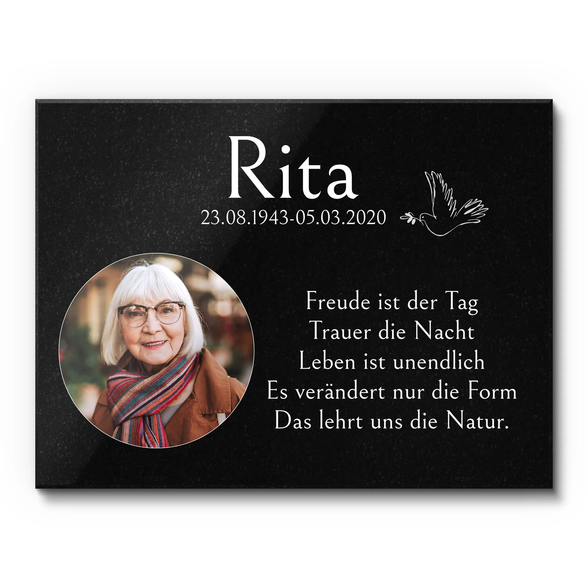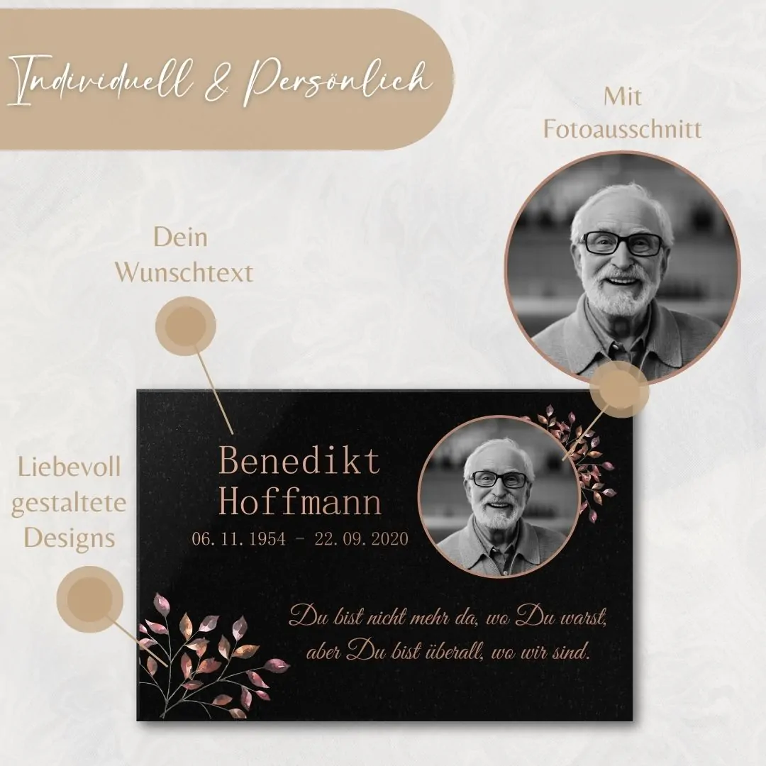 Bewahre die Erinnerung an einen geliebten Menschen mit unserer hochwertigen Granit-Gedenktafel, die durch farbigen UV-Druck zum Leben erweckt wird. Die aufwendig polierte Oberfläche des Granits spiegelt die Tiefe und die Bedeutung des Andenkens wider, während der lebendige Farbdruck die Persönlichkeit des Verstorbenen einfängt und ehrt.