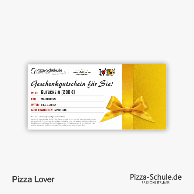 Überrasche deine Liebsten mit einem originellen und leidenschaftlichen Geschenk: Wähle die Geschenkgutschein von Pizza-Schule für ein unvergessliches Erlebnis in der Welt der Pizza. Perfekt für jede Gelegenheit, sei es Geburtstage, Weihnachten oder einfach nur, um Zuneigung zu zeigen, unsere Gutscheine sind die ideale Lösung für Pizza-Liebhaber und diejenigen, die die Kunst der Pizza erkunden möchten.