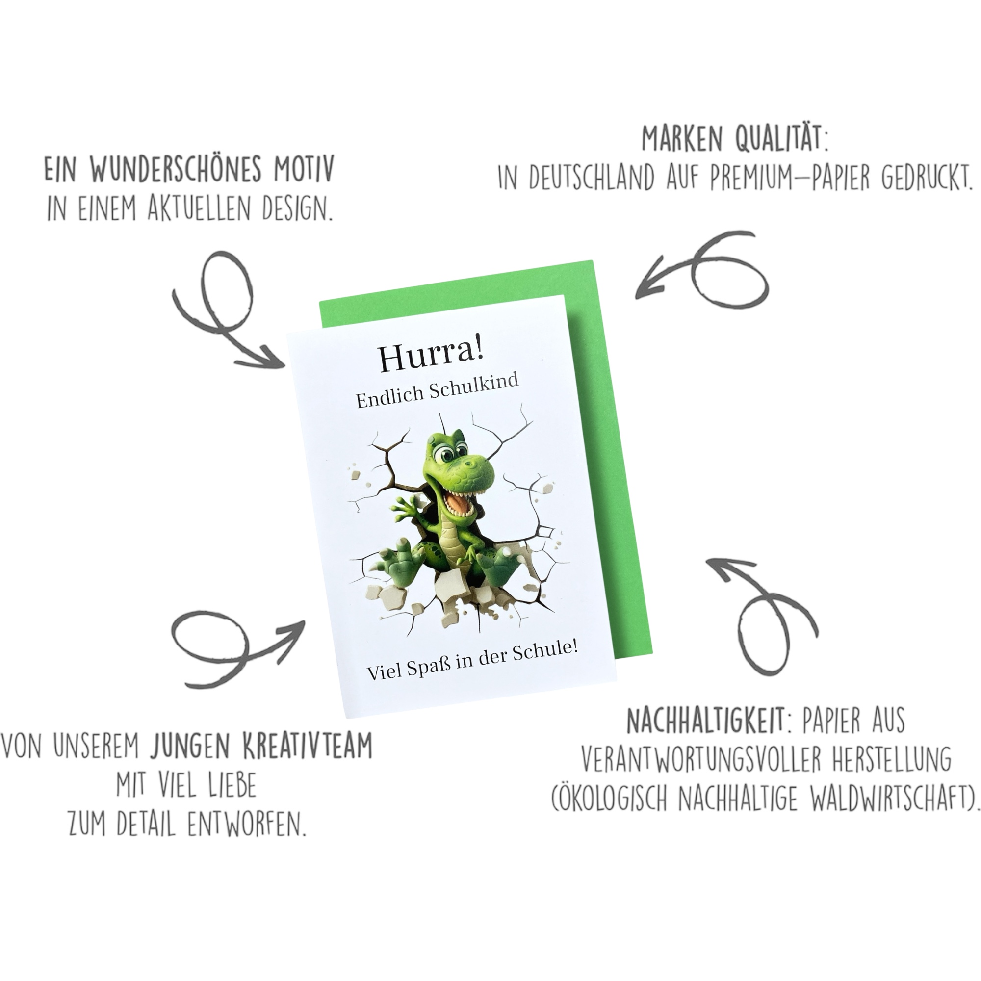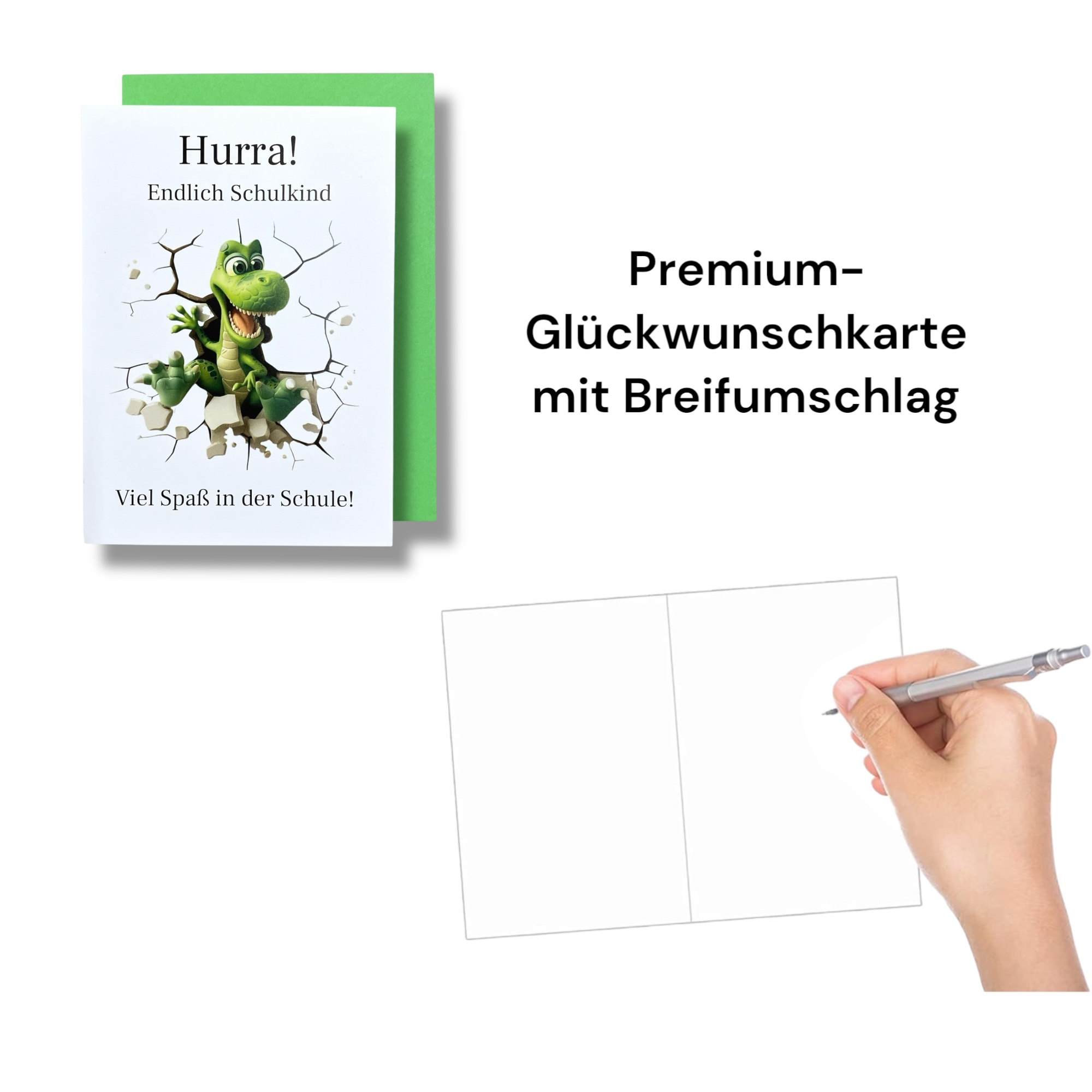 Glückwunschkarte zur Einschulung mit Dinosaurier-Motiv, A6 Format mit Umschlägen