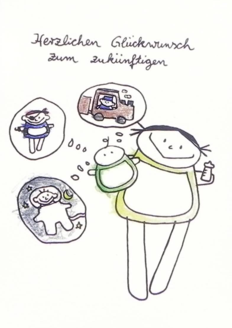 Hier stellt sich das Baby folgendes für die Zukunft vor: Lokführer, Astronaut und Pirat. Mutter – Mädel in gelb. Sie hält ein Baby in grün in der Hand und eine Nuckelflasche in der anderen Hand.