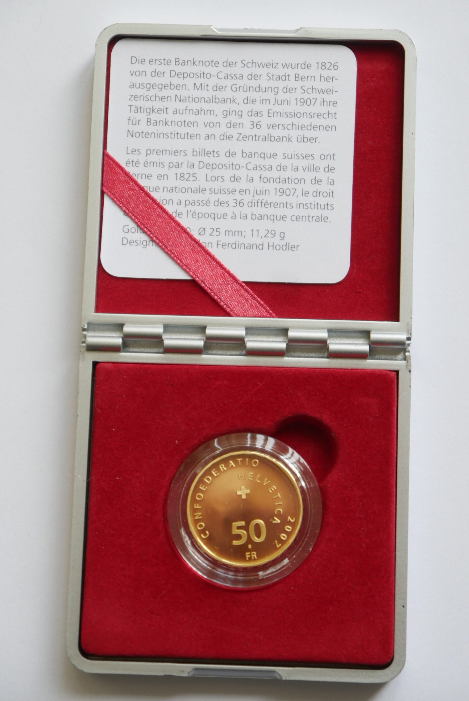 Die Goldmünze aus der Schweiz mit einem Feingehalt von 900 in Gelbgold ist ungebraucht und wurde bisher als Wertanlage verwahrt. Sie ist eine Sondermünze von 2007 mit einem Holzfäller sowie SNB BNS F. Hodler und auf der Zahlseite mit 50 Fr. Confoederatio geprägt .
