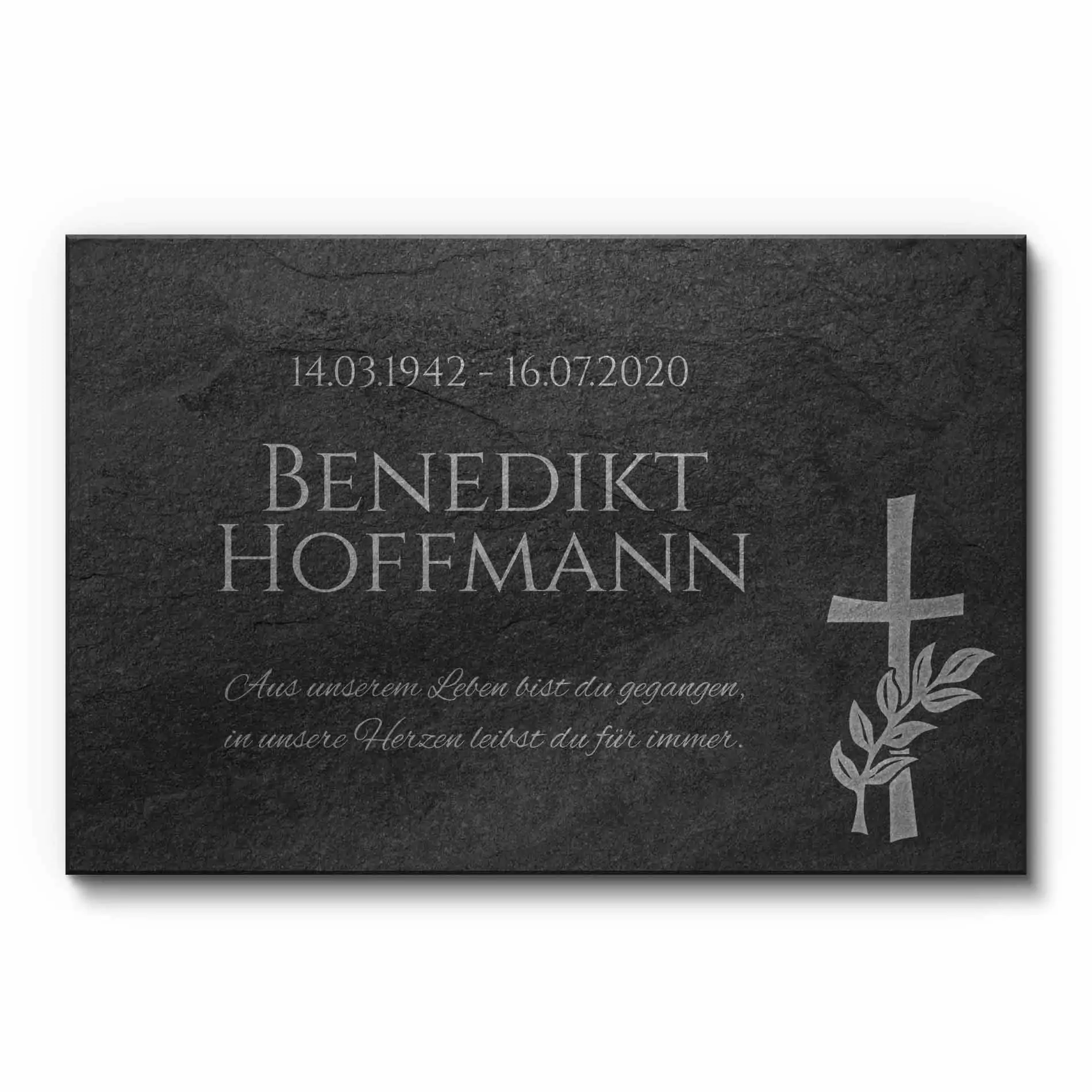 Es ist nie einfach einen besonderen Menschen loszulassen, der uns unendlich viel bedeutet hat und den wir für immer in unserer Erinnerung behalten werden. Halte all die wundervollen Momente und gefühlvollen Augenblicke, die Du mit dieser Person verbindest, auf einer stilvollen Gedenktafel aus Premium Schiefer fest. Die 1 cm starke Schieferplatte ist ideal, um ein Erinnerungsstück für die Ewigkeit zu gestalten. Klassisch und dezent, aber voller Liebe und Emotionen.