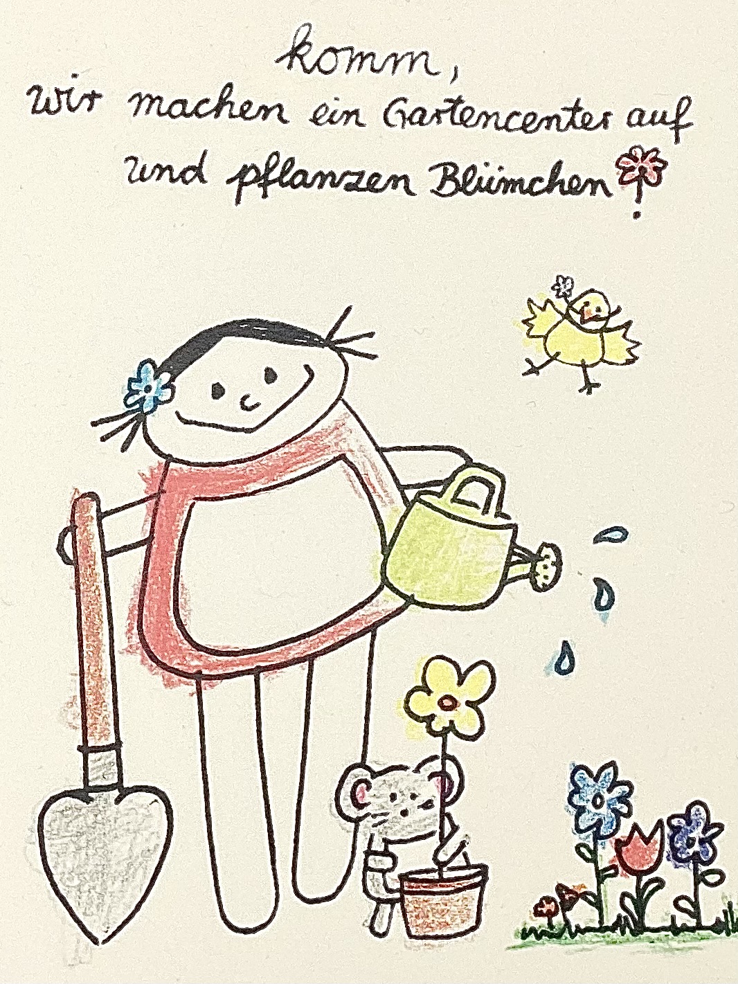 nini san Mädchen in rot mit hellgrüner Gießkanne. Sie hält einen Spaten in der Hand und ist bereit zum Loslegen. Neben ihr eine kleine graue Maus beim Blumeneinpflanzen. Mit kleiner Blumenwiese und gelben Vogel in der Luft.