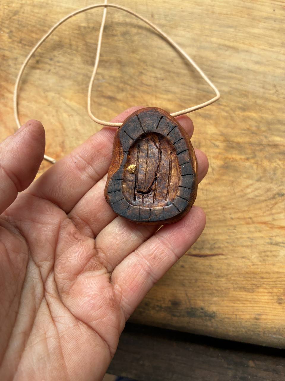 Dieser handgefertigte Kettenanhänger in Form einer Hobbittür, gefertigt aus einer Baumperle, ist ein kleines Stück Naturmagie zum Tragen.