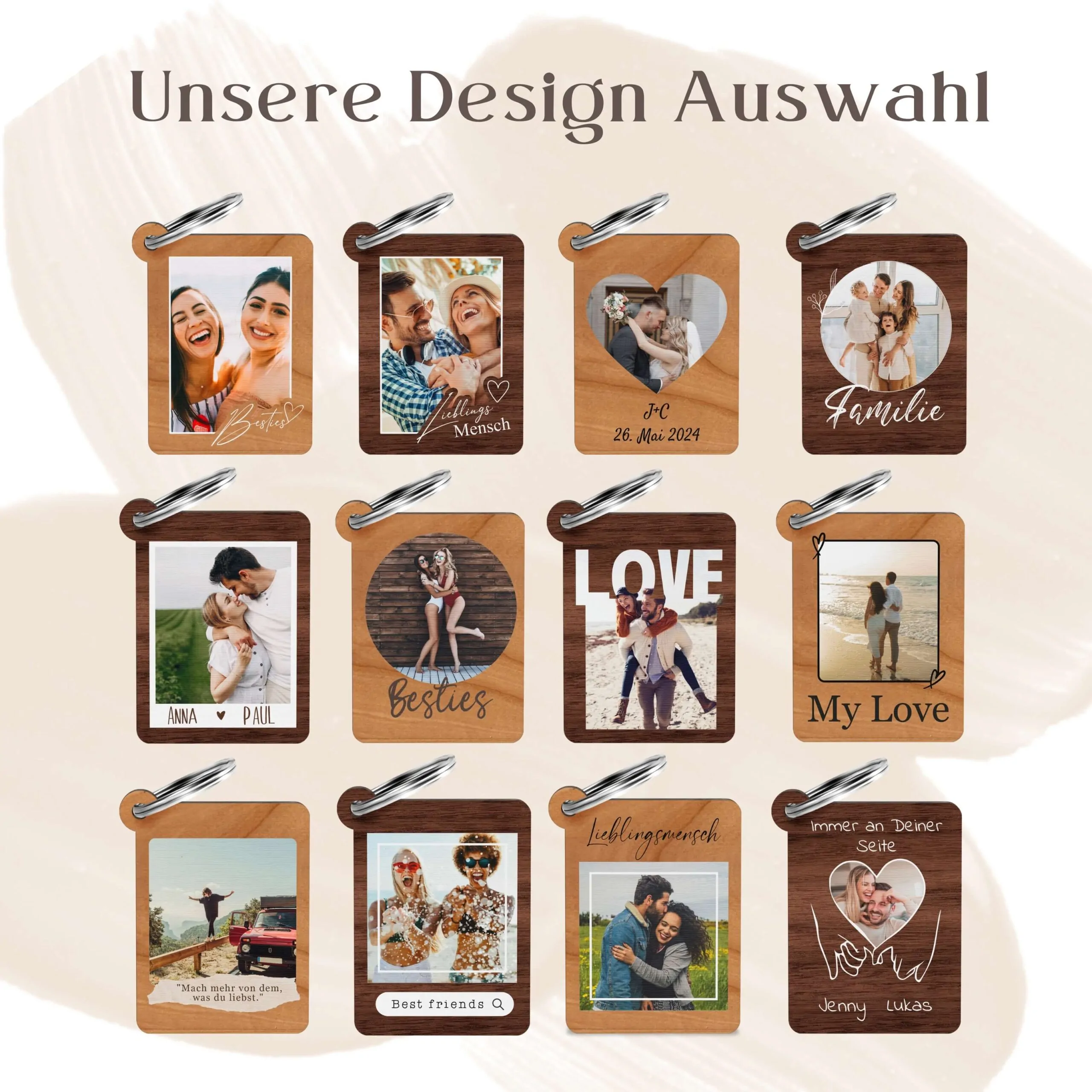 Unser personalisierter Schlüsselanhänger aus echtem Holz ist eine wundervolle Möglichkeit, deine schönsten Erinnerungen immer bei dir zu tragen. Mit deinem individuellen Foto bedruckt, wird jeder Anhänger zu einem echten Unikat. Die natürliche Holzmaserung verleiht ihm einen warmen, einzigartigen Charakter und macht ihn zu einem ganz besonderen Accessoire mit persönlicher Bedeutung.
