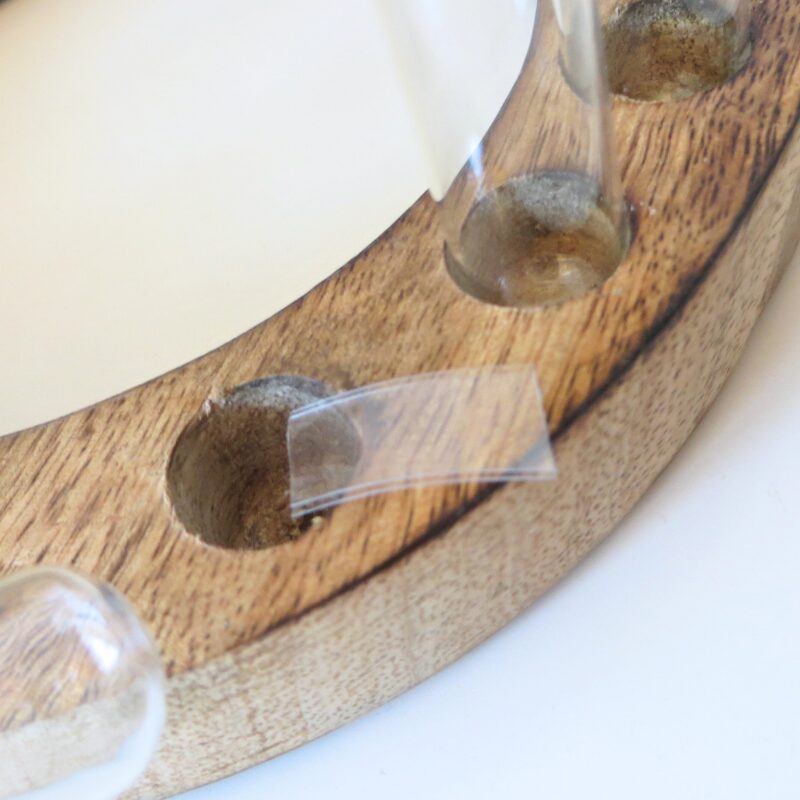 Der Holzkranz ist ein Naturprodukt, Abweichungen in Struktur und Farbe sind rein natürlich und kein Reklamationsgrund. Durch Kälte oder Wärme kann sich das Holz auch leicht verziehen, ausdehnen oder schrumpfen. Sollten die Reagenzgläser dadurch keinen festen Stand in den Löchern haben, sind jedem Kranz kleine Strips beigelegt, die in die Löcher eingelegt werden können. So bekommen die Gläser den nötigen Halt.