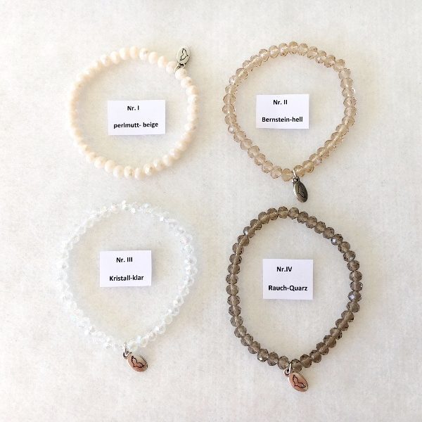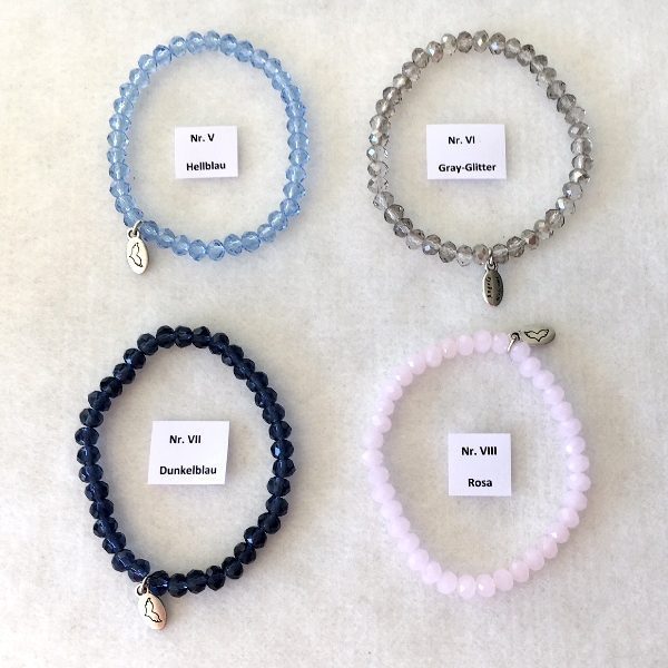 13 Armbandfarben stehen zur Wahl: permutt-beige * Bernstein-hell * Kristall-klar * Rauch-Quarz * hellblau * dunkelblau * pink/rose * ice * shiny blue * light blue * grey glitter * rainbow * blue water *