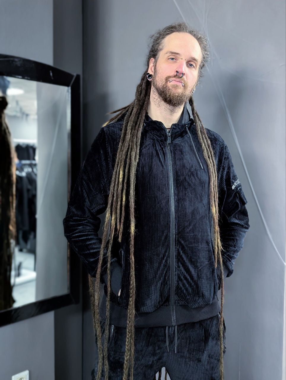 Schwarze Sweatjacke aus weichem Cordstoff mit Reißverschluss in der Mitte, einer Tasche am Ärmel und Kapuze.