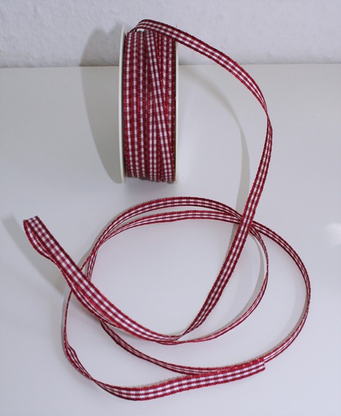 Vichy-Karoband schmal, dunkelrot, Breite 6 mm. Das Band hat formbare Drahtkante