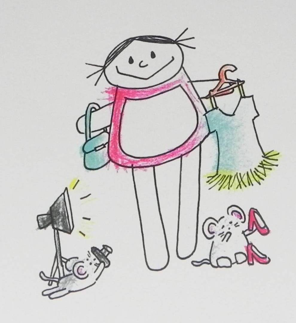 Am Boden liegt neben ihr eine Maus, die Fotos macht und eine zweite Maus hält ihr hochhockige, rote Schuhe bereit.