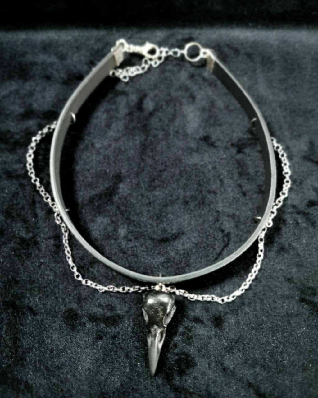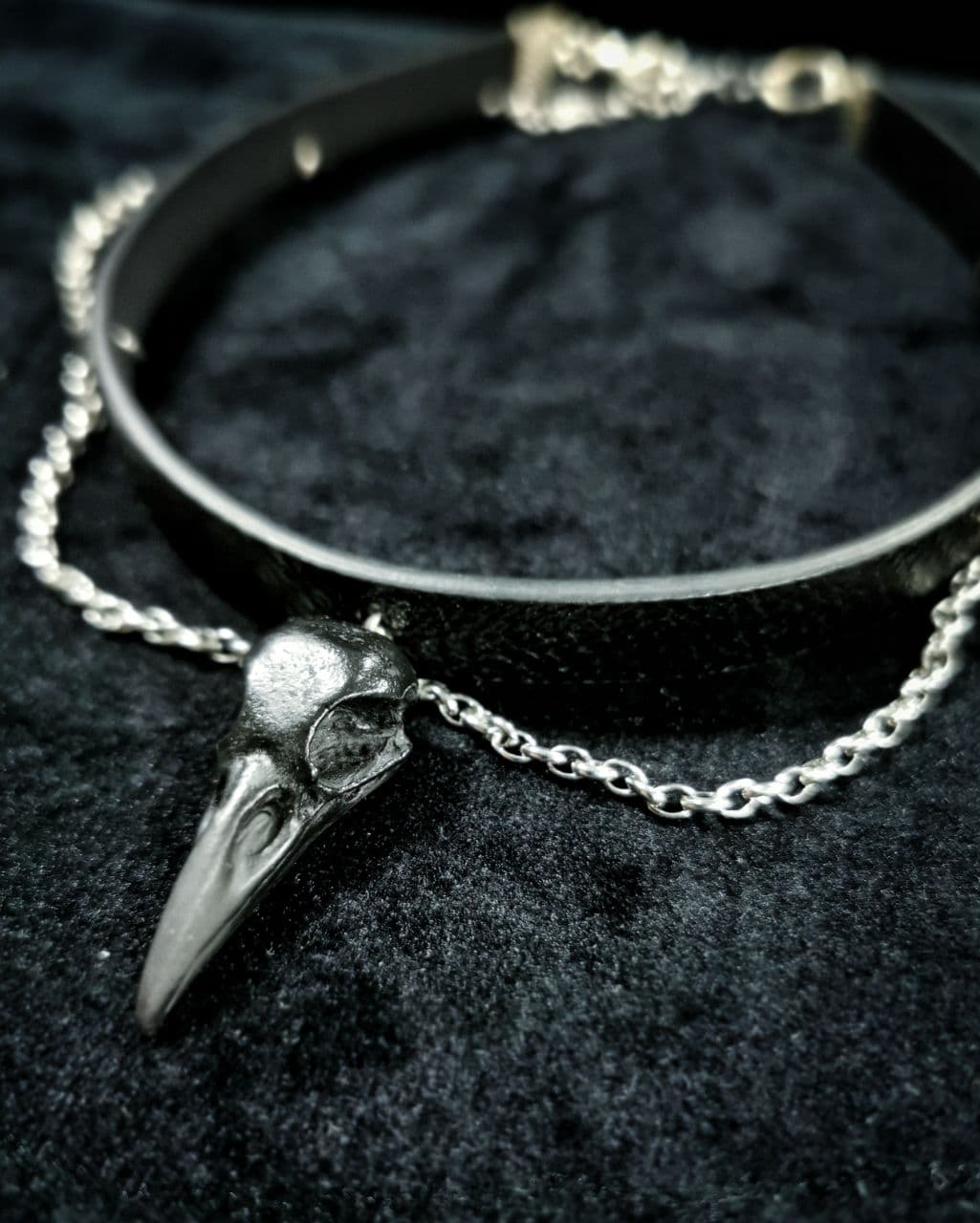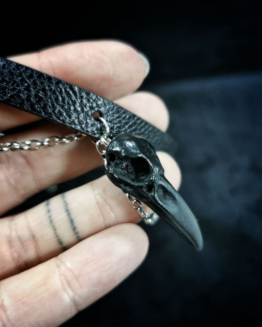 Handgefertigter kleiner Rabenschädel in schwarz an einem schwarzen, verstellbaren Kunstlederriemen mit drei Ketten von der polnischen Designerin Mystery Creation.