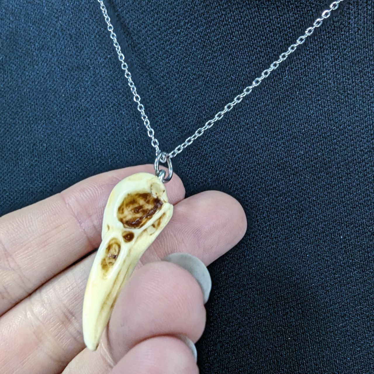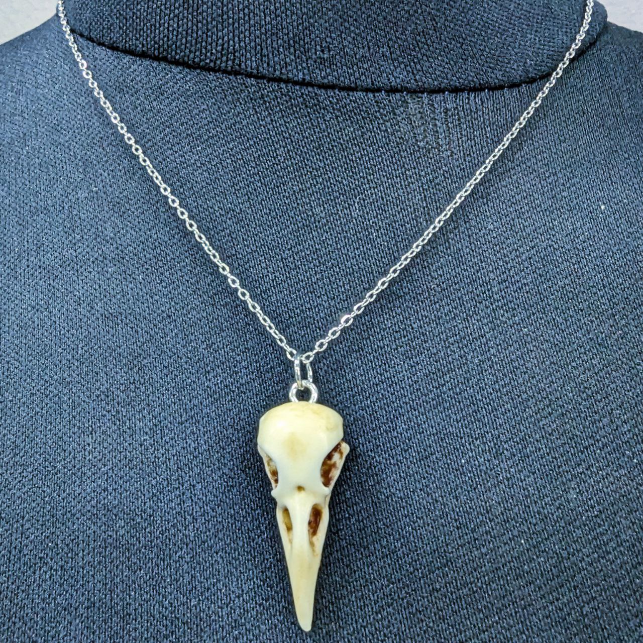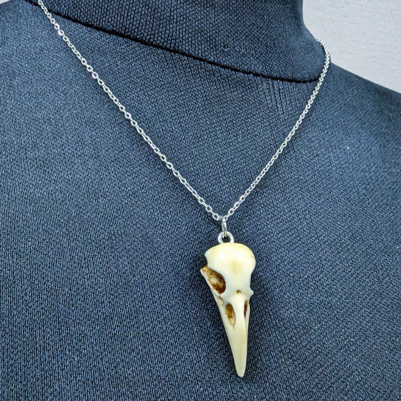 Handgefertigter kleiner Rabenschädel in natürlicher Knochenfärbung an einer silberfarbenen Kette aus Edelstahl von der polnischen Designerin Mystery Creation.
