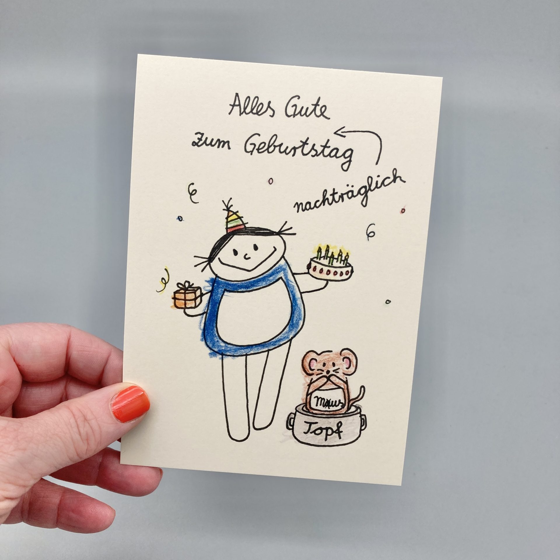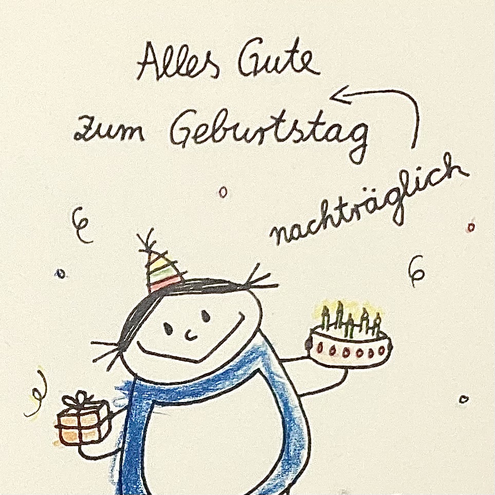 Die Karte sorgt sicher für ein Lächeln und zeigt: Auch ein nachträglicher Geburtstagsgruß kann von Herzen kommen.
