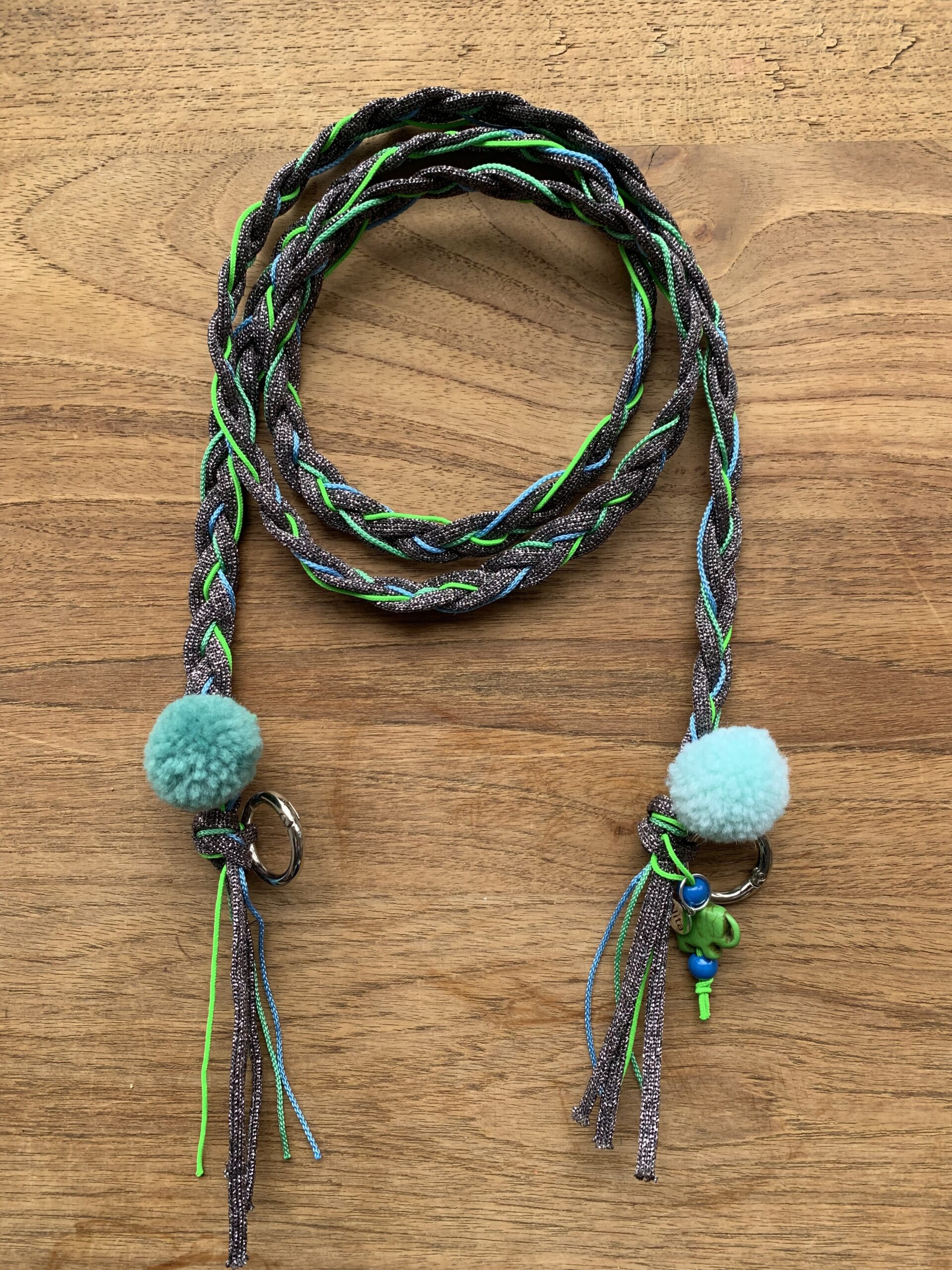 Zinkfarbene Glitzer Schnur mit neongrünen, mint und babyblauen Segeltaubändern geflochten