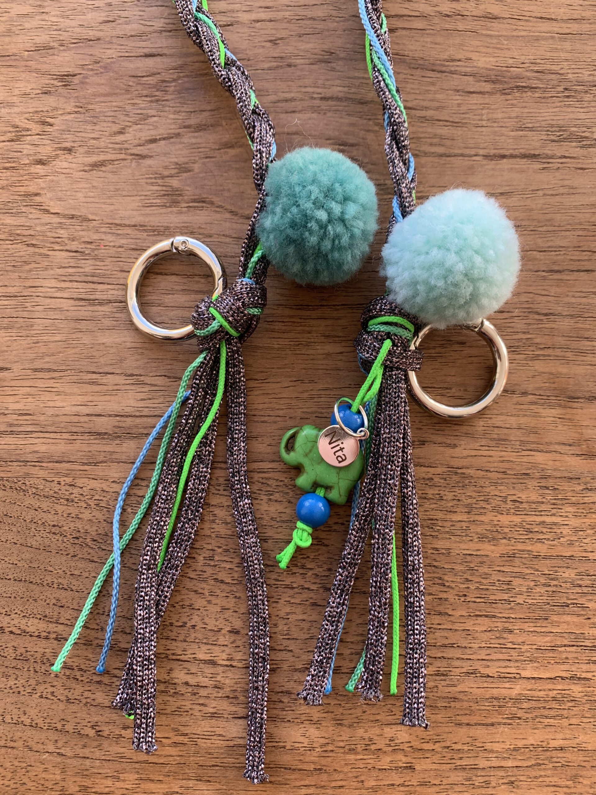 Liebevolles Detail sind die 2 Pompons an den Enden und der Anhänger mit kleinem Elefant und Perlen.