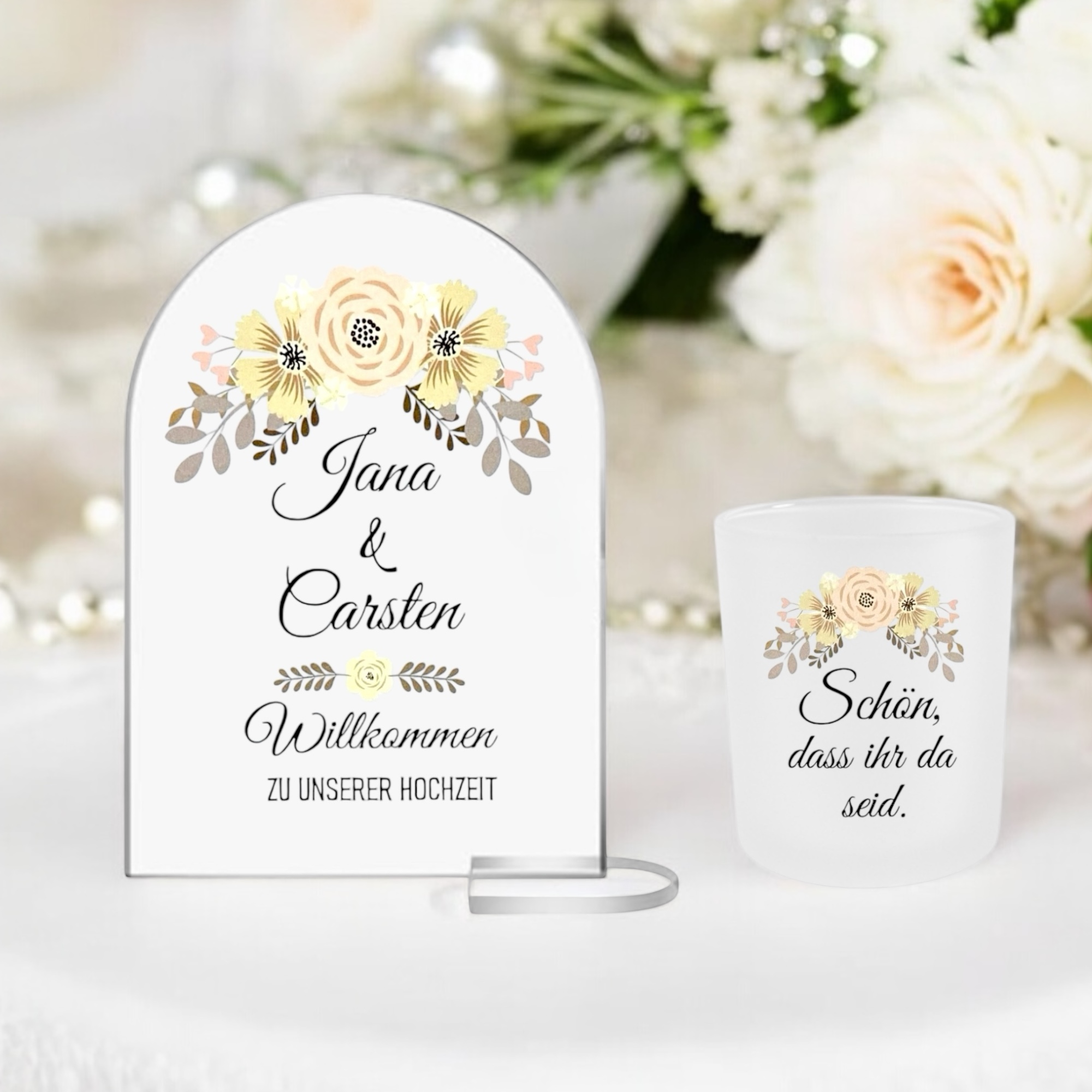 Verleihen Sie Ihrer Hochzeitsfeier einen einzigartigen und persönlichen Touch mit unseren hochwertigen RUB ON Stickern. Diese randlosen Aufkleber sind perfekt zur Dekoration von Tischaufstellern und Teelichtern geeignet und werden mit Ihren Namen individuell gestaltet. Das elegante Design mit zarten Blumenmotiven in warmen rose- und Beigetönen sowie dekorativen Blättern verleiht Ihrer Tischdekoration eine romantische Note. Jeder Sticker wird sorgfältig in Norddeutschland gefertigt und lässt sich einfach und präzise aufbringen. Das Set enthält sowohl größere Aufkleber für Willkommensschilder als auch kleinere Designs für Teelichter, sodass Sie eine harmonische und durchdachte Festdekoration gestalten können. Die randlosen Aufkleber lassen sich mühelos auf glatte Oberflächen wie Glas, Kunststoff, Holz und Keramik übertragen. Die Sticker haften zuverlässig auf glatten Oberflächen und sorgen für einen professionellen, hochwertigen Look Ihrer Hochzeitsdekoration.