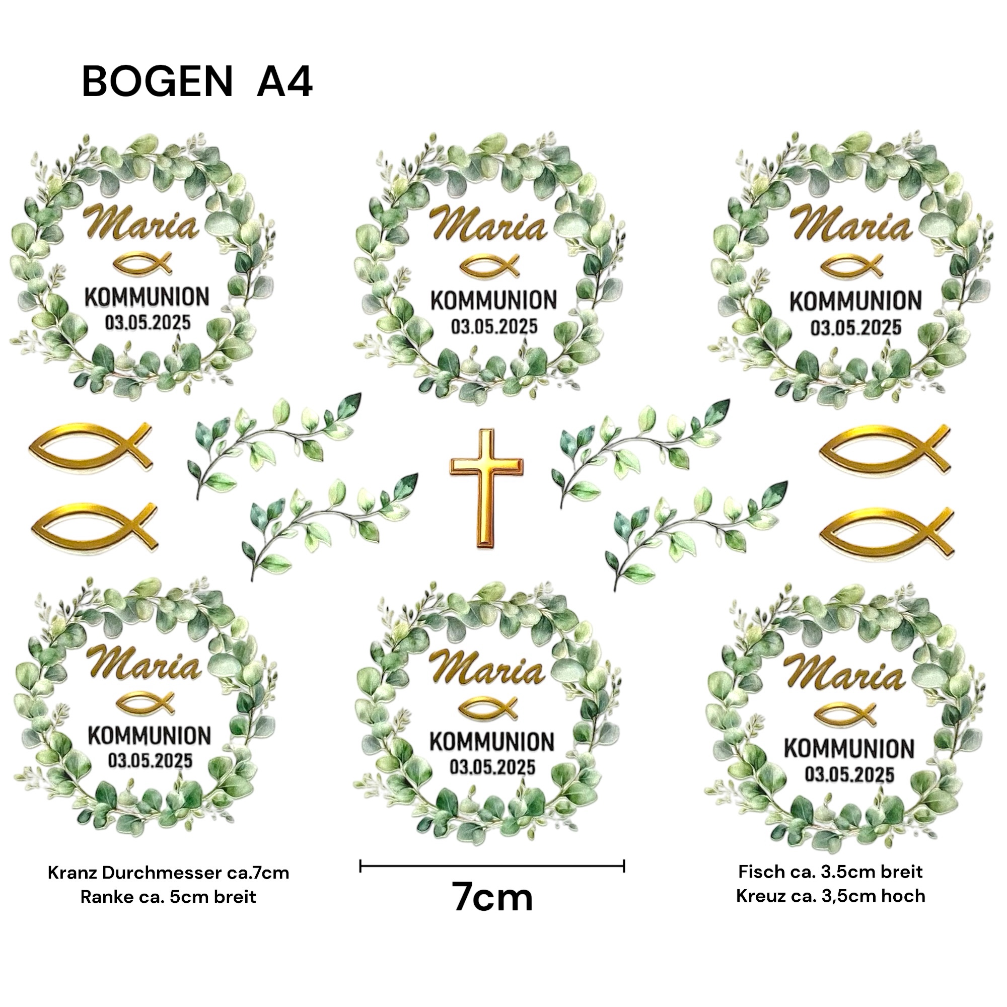 Personalisierte RUB ONs Sticker mit Eukalyptus-Kranz, Kommunion, Teelicht, Tischdeko, randlose Rubons Sticker