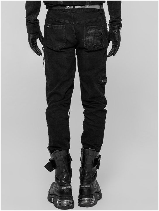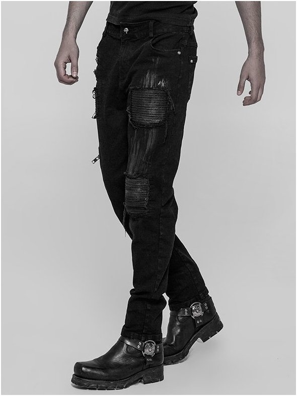Schwarze aufwendige Hose von Punkrave mit zahlreichen eingearbeiteten Waschungen im destroyed Look.