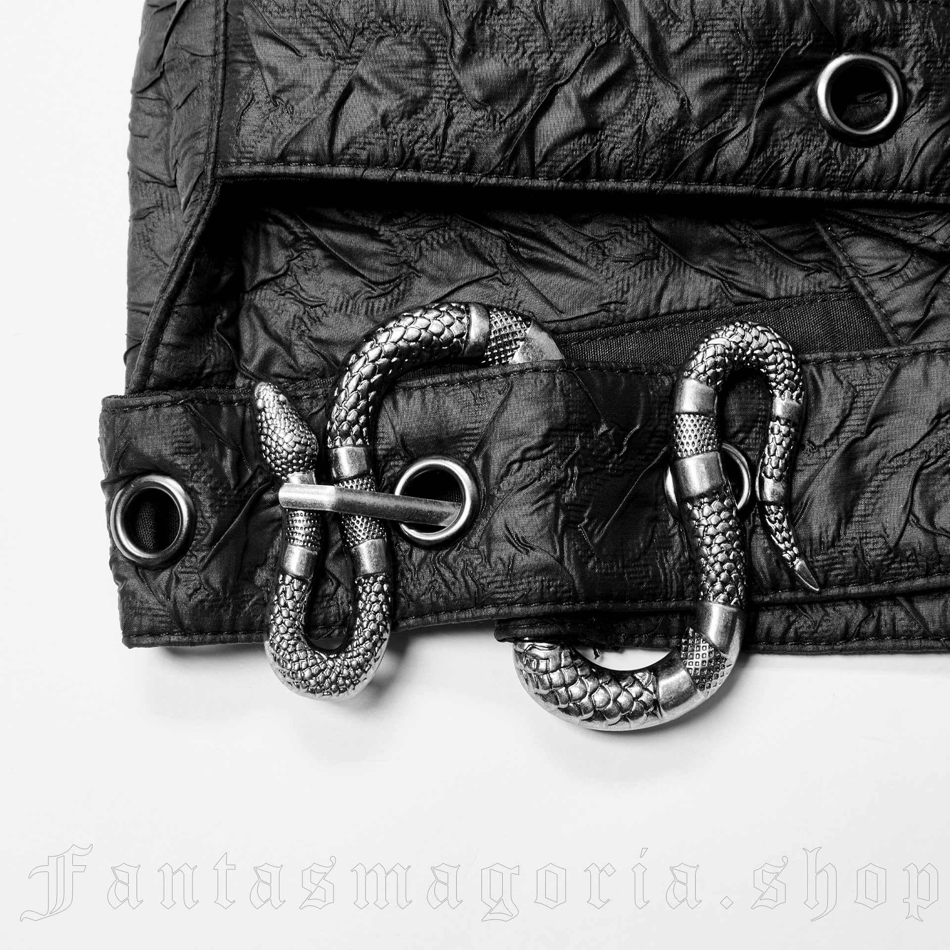 Schwarzer Brust-Harness von Punkrave mit verschiedenen Riemen, Schnallen, einer Tasche sowie einer Schlange als Verschluss.
