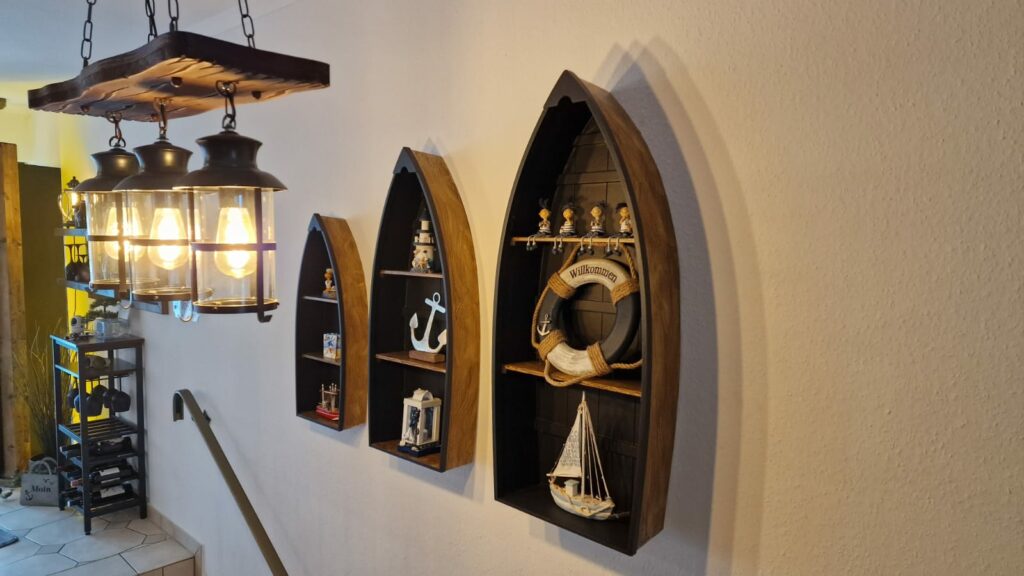 Egal, ob du eine kleine Ecke verschönern möchtest oder eine ganze Wand in deinem Wohnzimmer gestalten willst, das Regal “Ruderboot” passt sich deinen Bedürfnissen an. Wähle aus den verschiedenen Größen oder kombiniere sie zu einem beeindruckenden Gesamtbild. Jedes Regal ist dabei mehr als nur ein Aufbewahrungsort; es ist eine Bühne für deine wertvollsten Erinnerungen und Geschichten.