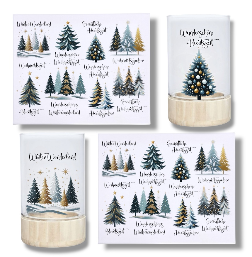 Rub-Ons-Sticker, große Tännenbäume grün-gold, DIN A4, Sprüche, Weihnachten, randlose Rubons