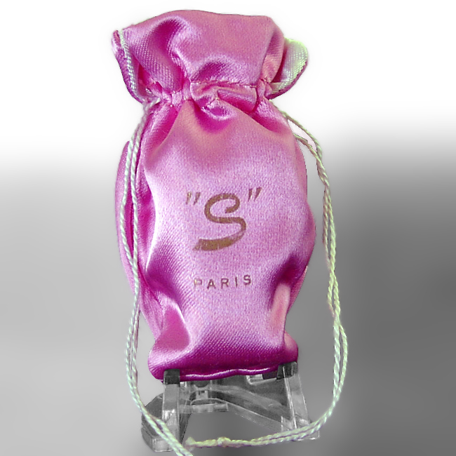 10 ml EdT, goldener Schraubverschluß, pinkfarbenes Papieretikett mit weißem Druck, 64 mm hoch, mit pinkfarbenem Satinbeutel