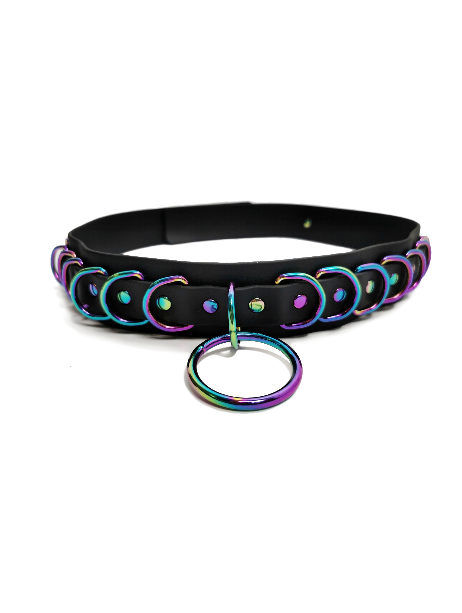 Bunt schillernder veganer handmade Taillengürtel von der Künstlerin Sacred Sins mit zahlreichen D-Ringen und einem O-Ring.