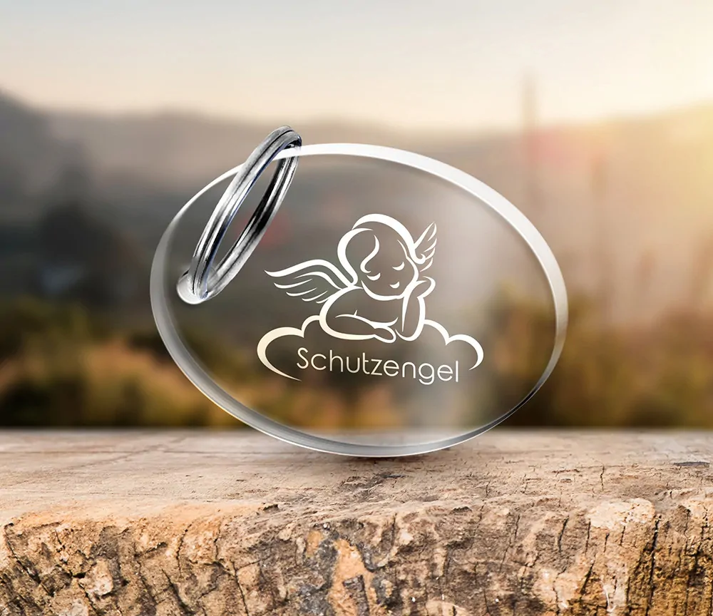 Schlüsselanhänger mit Gravur „Schutzengel“ Oval aus Acrylglas