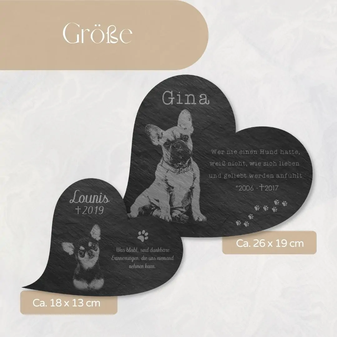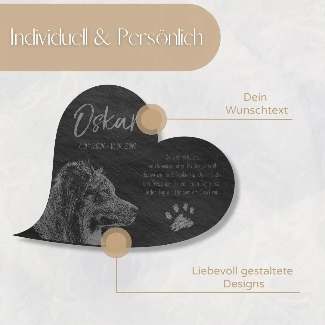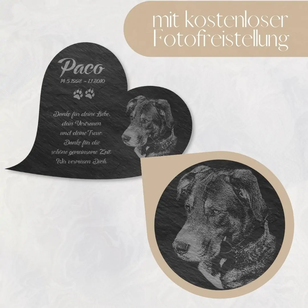 Der Tod ist die Grenze des Lebens aber nicht der Liebe. Verewige all die unvergesslichen Stunden mit Deinem Lieblings-Vierbeiner auf einem hochwertigen Katzengrabstein oder Hundegrabstein aus Premium Schiefer. Mit jedem Blick auf dieses bildschöne Unikat wirst Du Dich an gemeinsame Augenblicke zurückerinnern. Damit kannst Du Dir bei uns ein ganz einzigartiges Erinnerungsstück gestalten, welches Deinen Hund, Deine Katze oder auch Dein Pferd für immer in Ehren halten wird. Wir können für Dich sogar ein eigenes Bild Deines treuen Wegbegleiters auf die ca. 5 mm starke Schieferplatte gravieren. Natürlich kannst Du das Tier Gedenkherz auch mit einem schönen Trauerspruch, einer persönlichen Widmung oder einem hübschen Motiv zusätzlich verzieren. Neben dem unvergleichlichen individuellen Design überzeugt der Tiergrabstein mit Bild außerdem mit seiner Witterungsbeständigkeit – auch im Außenbereich für ein Tiergrab oder eine Ruhestätte bestens geeignet.