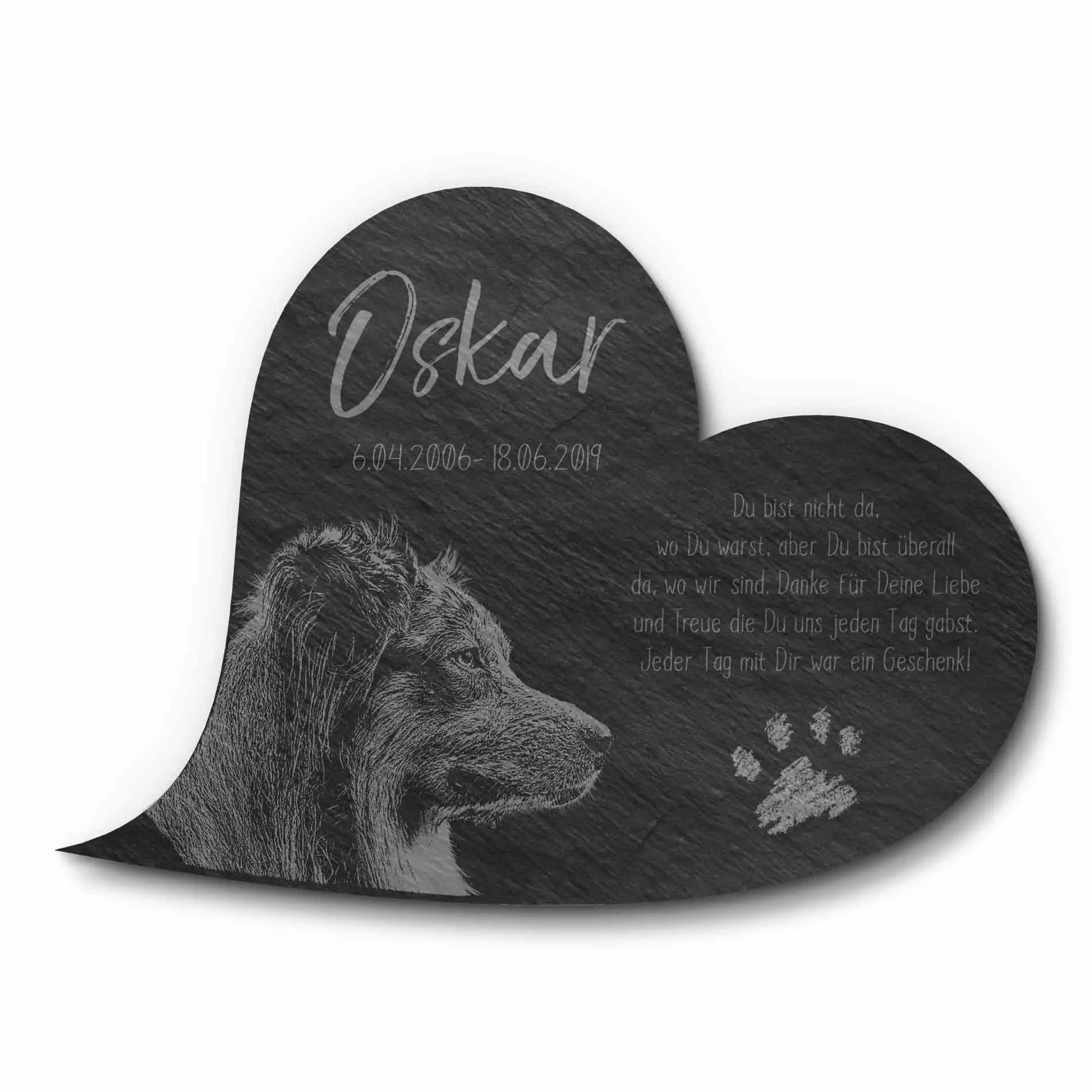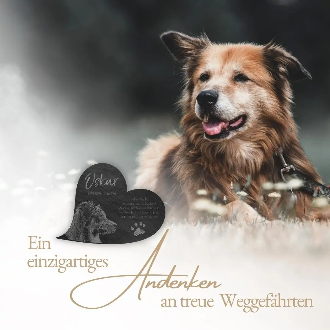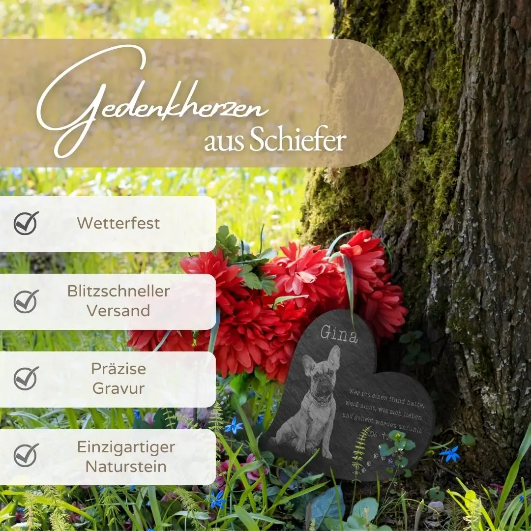 Der Tod ist die Grenze des Lebens aber nicht der Liebe. Verewige all die unvergesslichen Stunden mit Deinem Lieblings-Vierbeiner auf einem hochwertigen Katzengrabstein oder Hundegrabstein aus Premium Schiefer. Mit jedem Blick auf dieses bildschöne Unikat wirst Du Dich an gemeinsame Augenblicke zurückerinnern. Damit kannst Du Dir bei uns ein ganz einzigartiges Erinnerungsstück gestalten, welches Deinen Hund, Deine Katze oder auch Dein Pferd für immer in Ehren halten wird. Wir können für Dich sogar ein eigenes Bild Deines treuen Wegbegleiters auf die ca. 5 mm starke Schieferplatte gravieren. Natürlich kannst Du das Tier Gedenkherz auch mit einem schönen Trauerspruch, einer persönlichen Widmung oder einem hübschen Motiv zusätzlich verzieren. Neben dem unvergleichlichen individuellen Design überzeugt der Tiergrabstein mit Bild außerdem mit seiner Witterungsbeständigkeit – auch im Außenbereich für ein Tiergrab oder eine Ruhestätte bestens geeignet.