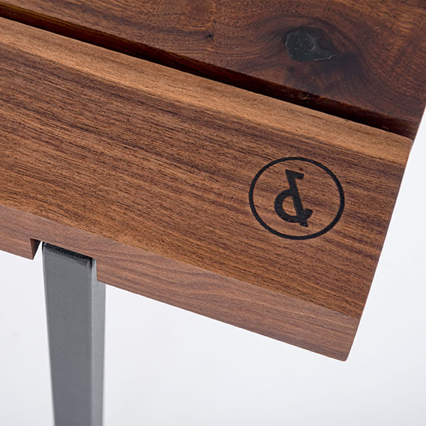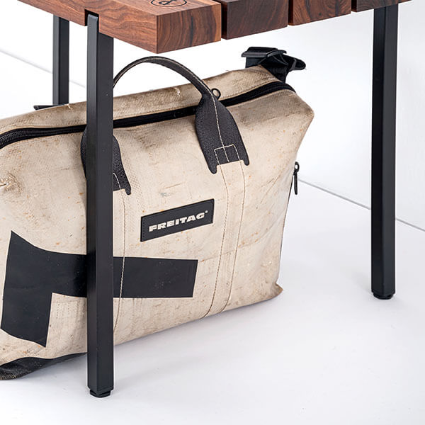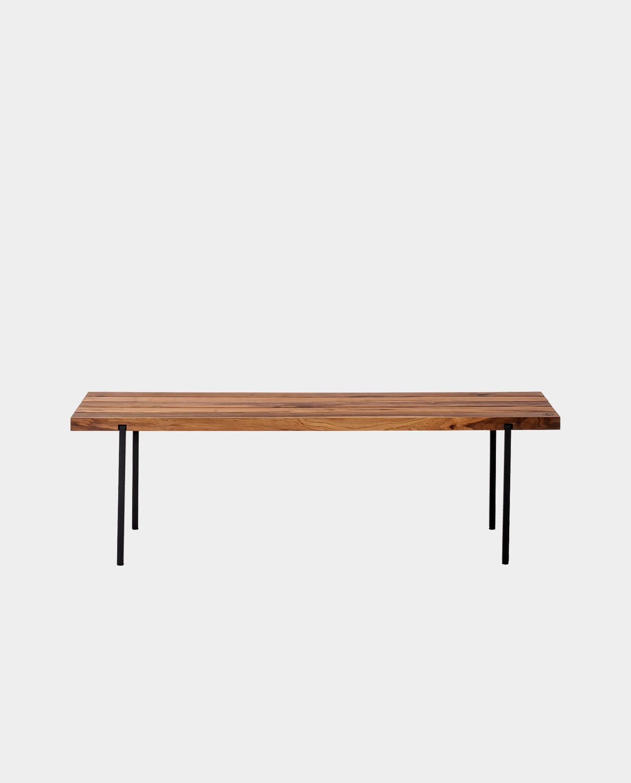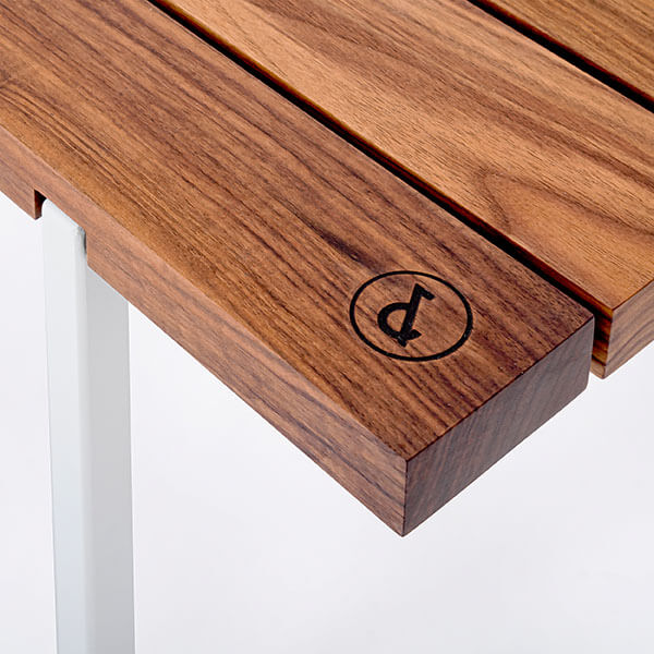 Die Sitzfläche der Bank ist aus Bohlen aus massivem Nussbaumholz mit einem eleganten Schimmer gefertigt, die Beine sind aus Stahl, versehen mit einer feinen und zugleich robusten Pulverbeschichtung. Dieser Materialkontrast macht die Sitzbank zum Design-Highlight.