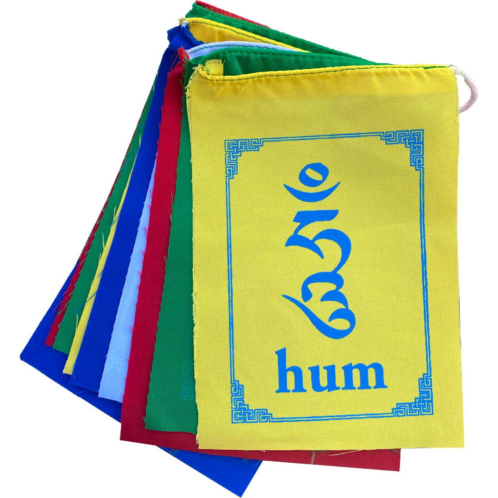 Hochwertige farbige tibetische Flaggen mit den Silben des Mantras Om Mani Padme Hum. Gestochen scharfer Druck in hoher Qualität mit schönen kräftigen Farben.