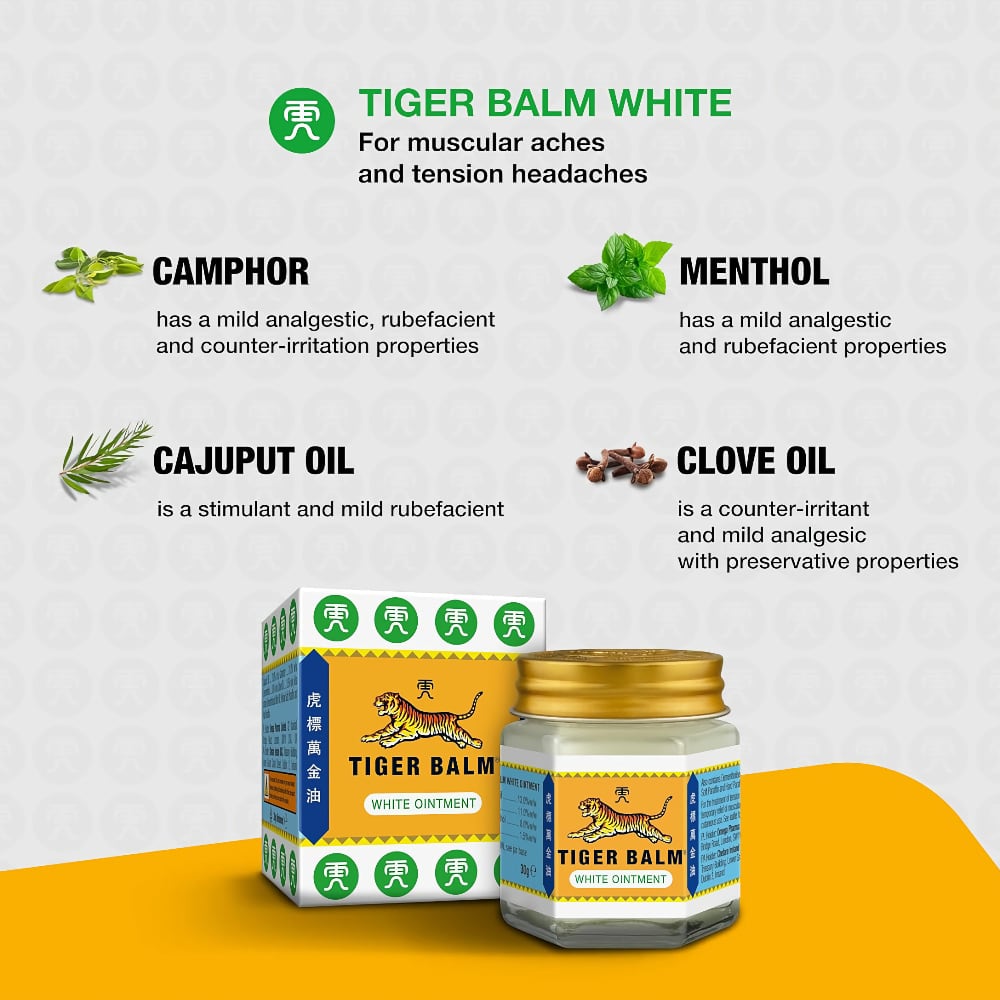 Tiger Balm weiß ist ein bewährter, sicherer und wirksamer Kräuterbalsam zur Behandlung von Spannungskopfschmerzen, die auftreten können, wenn Ihre Kopf-, Nacken- und Schultermuskulatur aufgrund von Müdigkeit, Überarbeitung oder emotionaler Anspannung verspannt ist.
